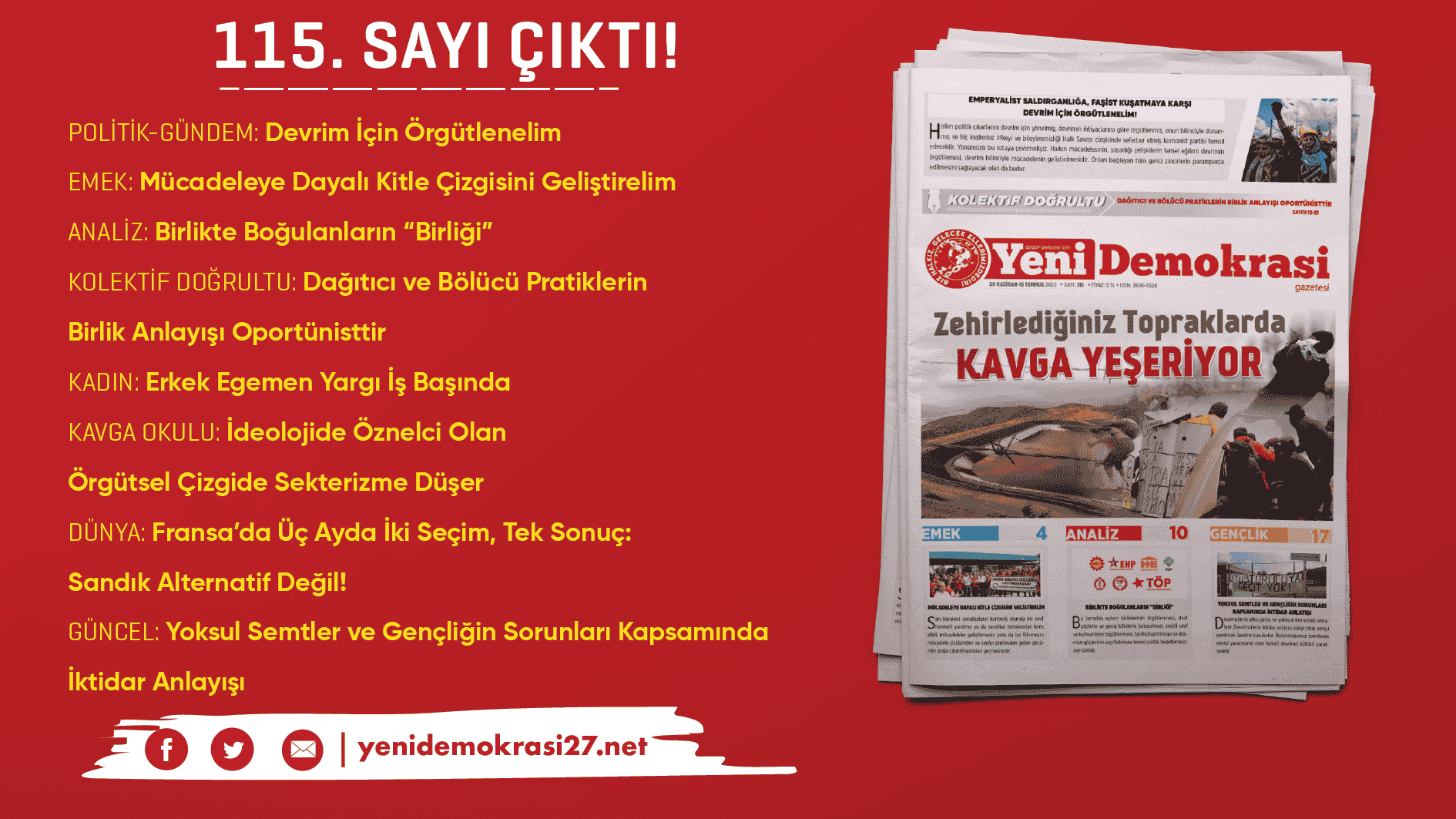 İSTANBUL– Gazetemiz Yeni Demokrasi’nin 115. sayısı “Zehirlediğiniz Topraklarda Kavga Yeşeriyor” manşetiyle çıktı. Gazetemize Umut Yayımcılık büroları, Kadıköy ve Taksim Mephisto Kitabevi’nden ulaşabilirsiniz.
