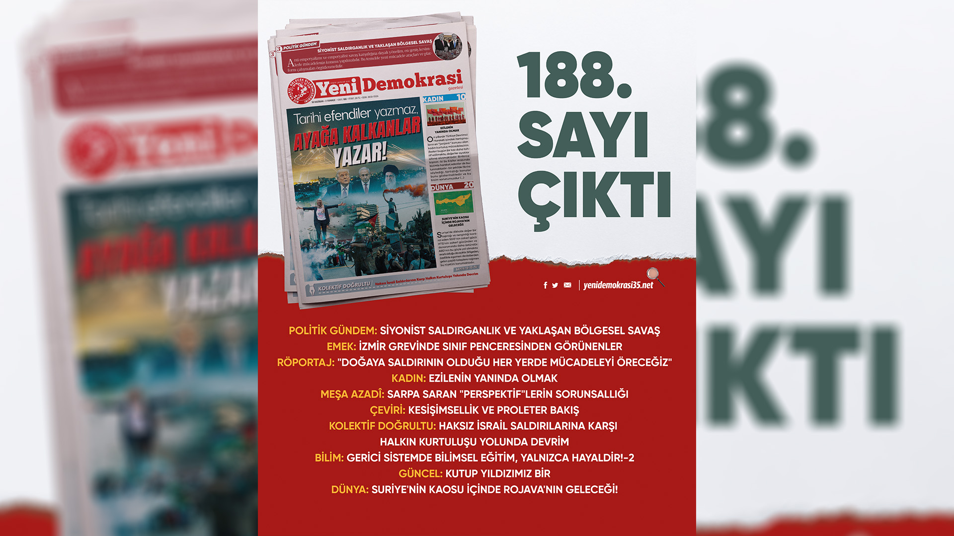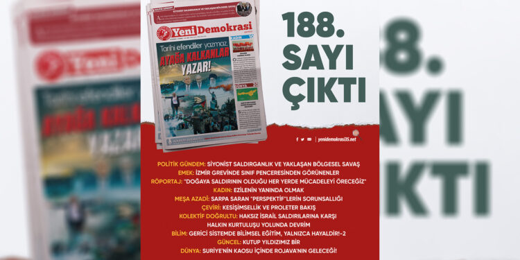 Gazetemiz Yeni Demokrasi’nin 188. sayısı “Tarihi Efendiler Yazmaz, Ayağa Kalkanlar Yazar!” manşetiyle çıktı. Gazetemize Umut Yayımcılık büroları, Kadıköy ve Taksim Mephisto Kitabevi’nden ulaşabilirsiniz.