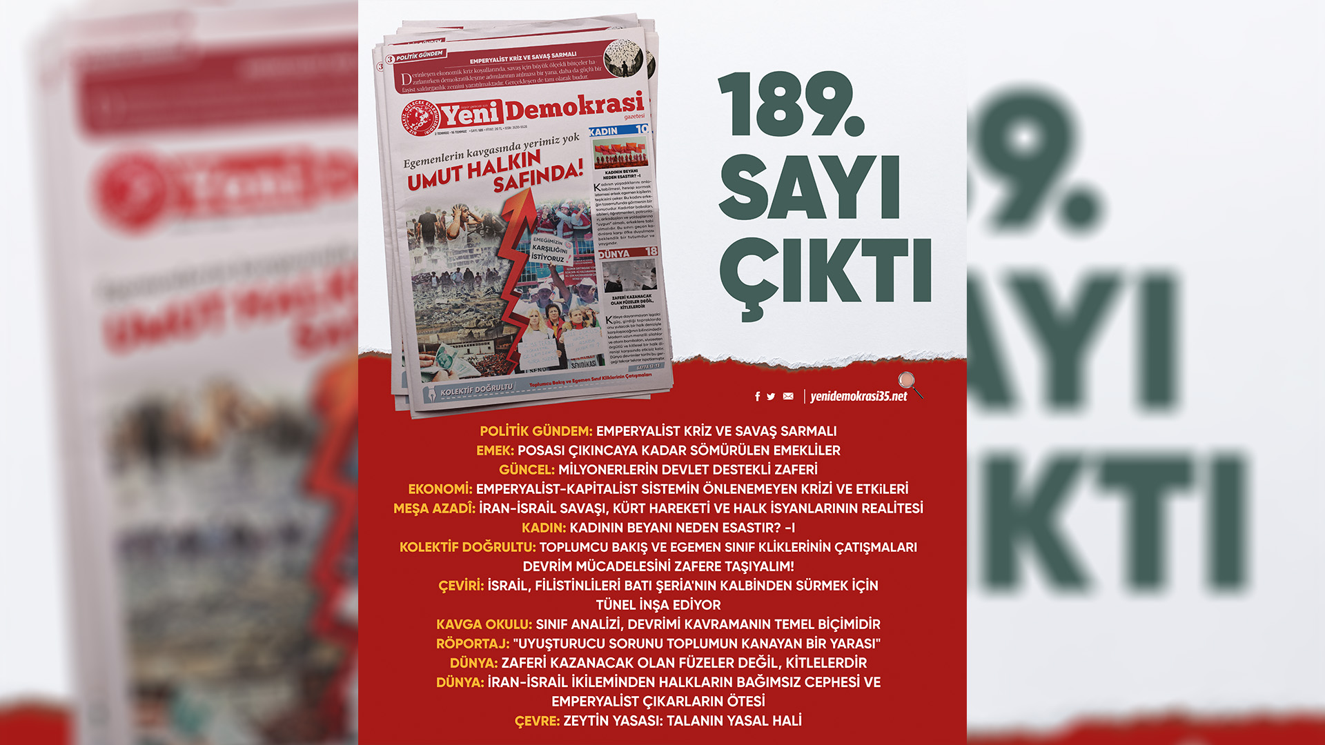 Gazetemiz Yeni Demokrasi’nin 189. sayısı “Egemenlerin Kavgasında Yerimiz Yok! Umut Halkın Safında!” manşetiyle çıktı. Gazetemize Umut Yayımcılık büroları, Kadıköy ve Taksim Mephisto Kitabevi’nden ulaşabilirsiniz.