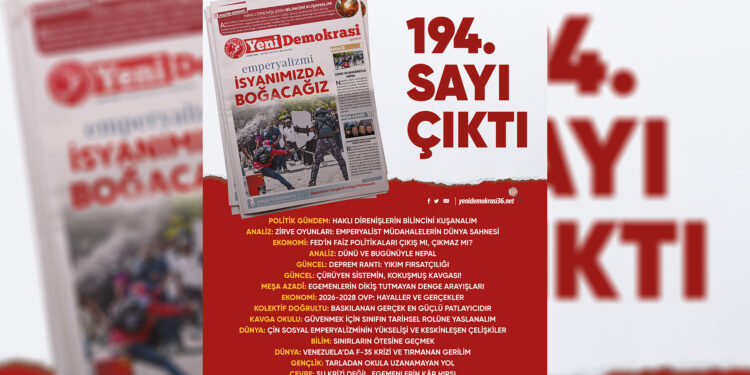 Gazetemiz Yeni Demokrasi’nin 194. sayısı “Emperyalizmi İsyanımızda Boğacağız” manşetiyle çıktı. Gazetemize Umut Yayımcılık büroları, Kadıköy ve Taksim Mephisto Kitabevi’nden ulaşabilirsiniz.