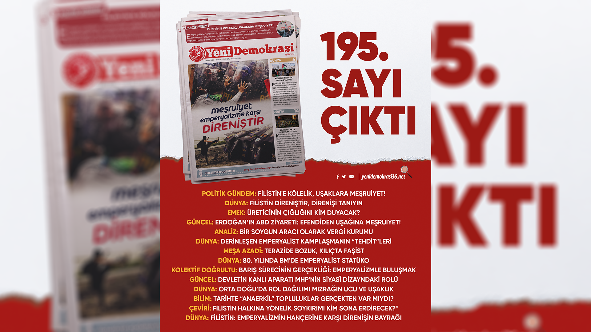 Gazetemiz Yeni Demokrasi’nin 195. sayısı “Meşruiyet Emperyalizme Karşı Direniştir” manşetiyle çıktı. Gazetemize Umut Yayımcılık büroları, Kadıköy ve Taksim Mephisto Kitabevi’nden ulaşabilirsiniz.
