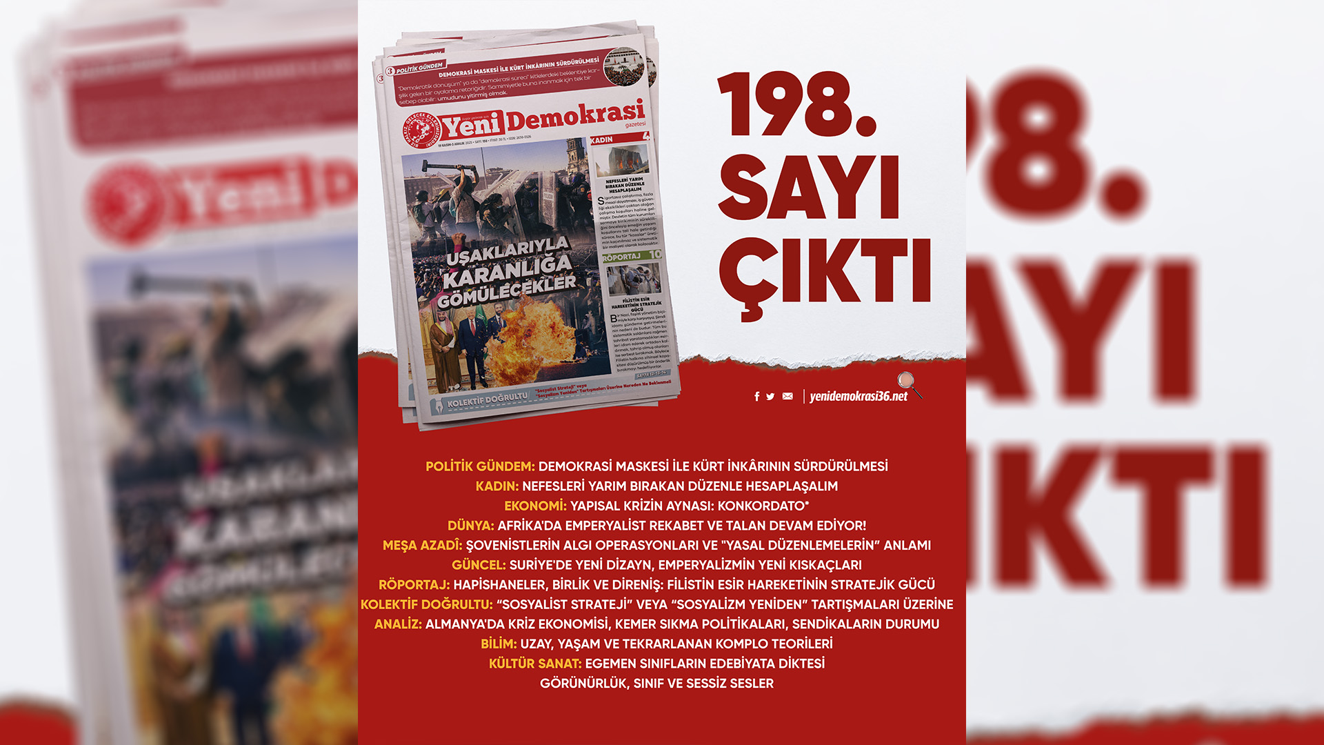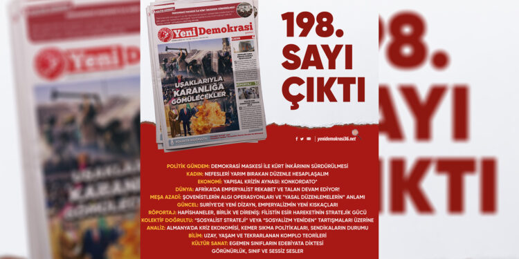Gazetemiz Yeni Demokrasi’nin 198. sayısı “Uşaklarıyla Karanlığa Gömülecekler” manşetiyle çıktı. Gazetemize Umut Yayımcılık büroları, Kadıköy ve Taksim Mephisto Kitabevi’nden ulaşabilirsiniz.