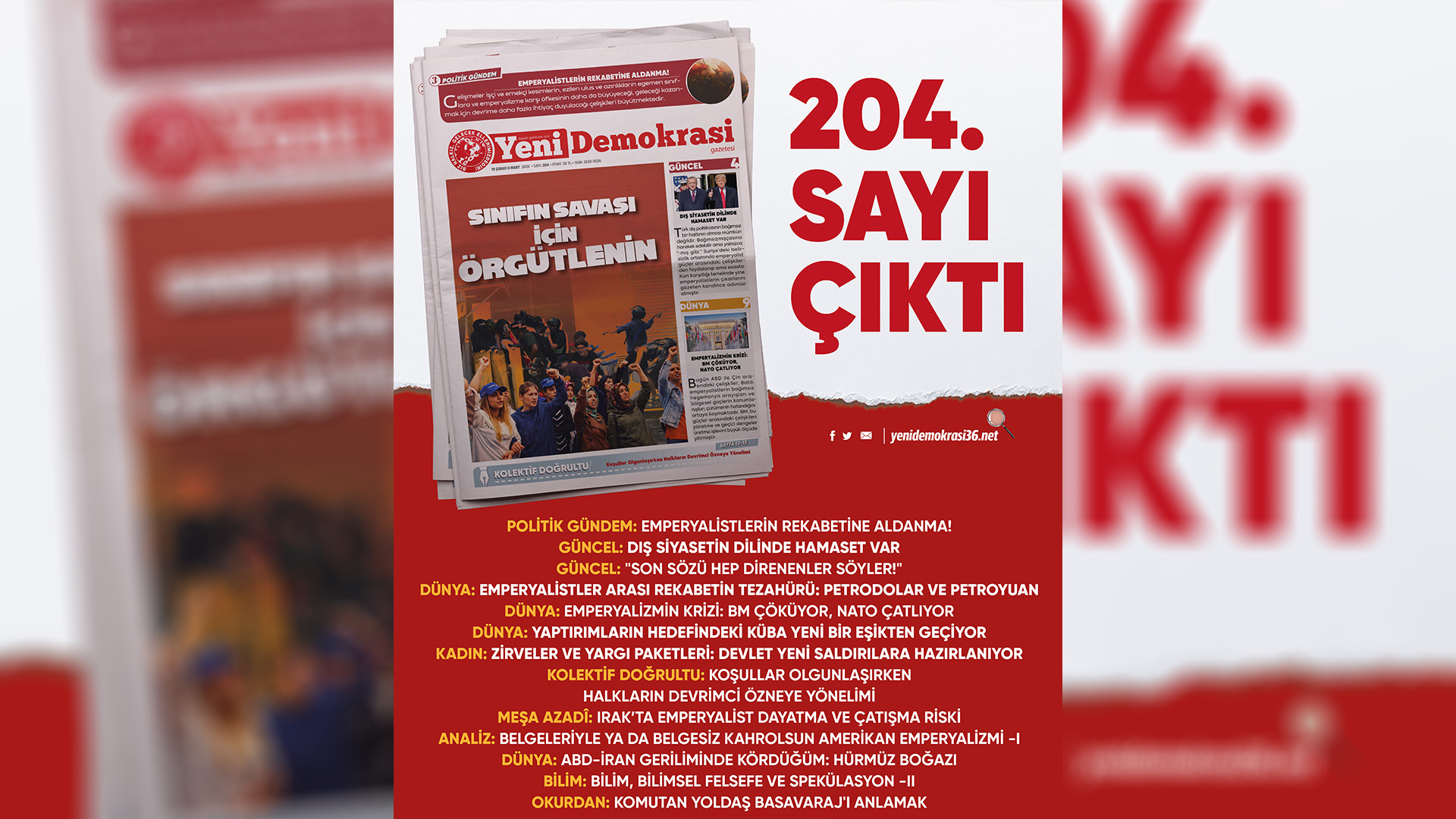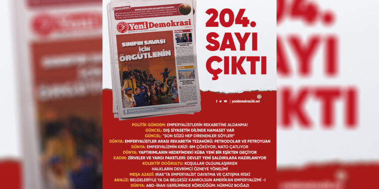 Gazetemiz Yeni Demokrasi’nin 204. sayısı “Sınıfın Savaşı İçin Örgütlenin” manşetiyle çıktı. Gazetemize Umut Yayımcılık büroları, Kadıköy ve Taksim Mephisto Kitabevi’nden ulaşabilirsiniz.