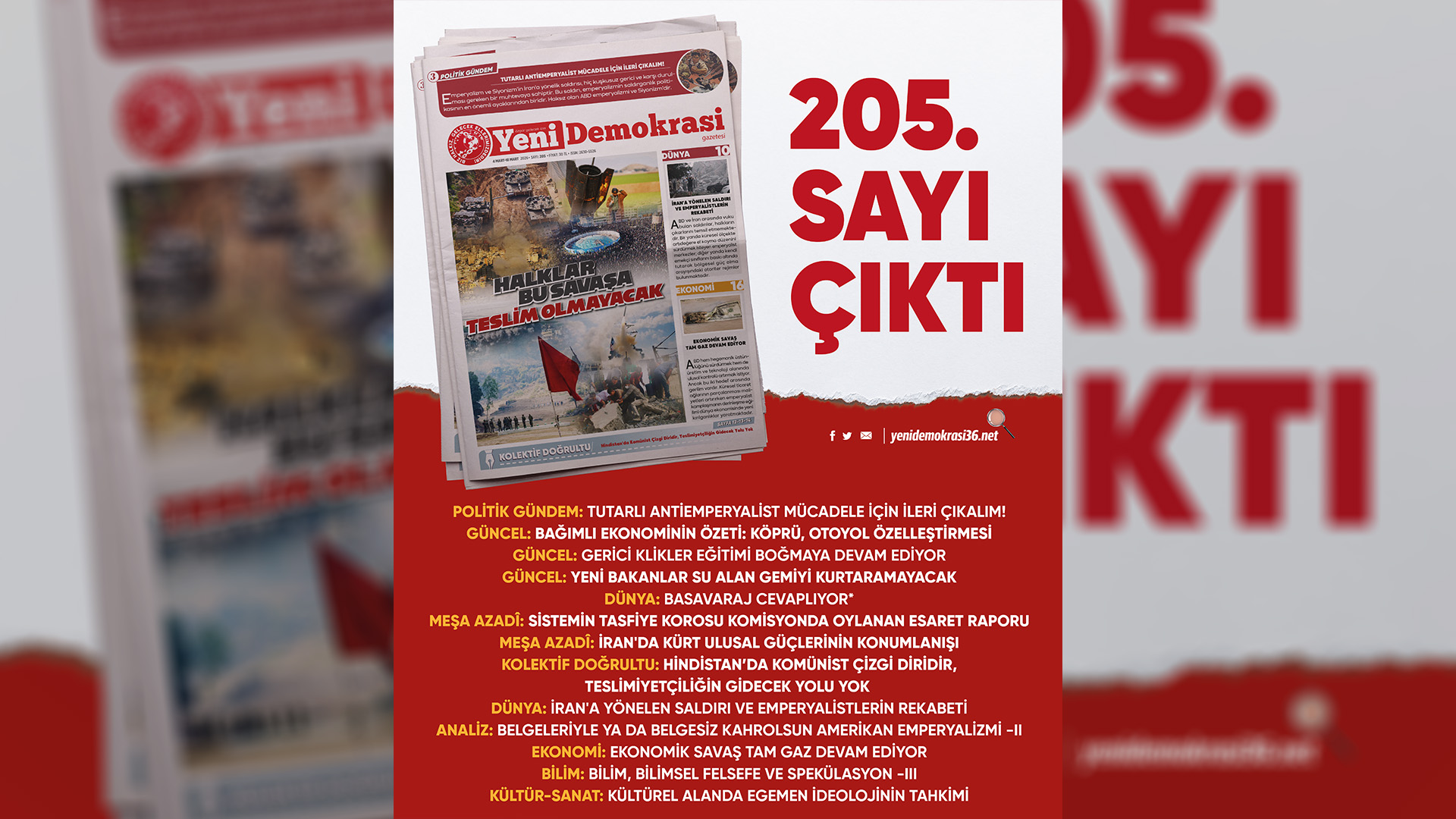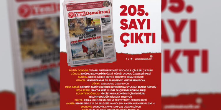 Gazetemiz Yeni Demokrasi’nin 205. sayısı “Halklar Bu Savaşa Teslim Olmayacak” manşetiyle çıktı. Gazetemize Umut Yayımcılık büroları, Kadıköy ve Taksim Mephisto Kitabevi’nden ulaşabilirsiniz.