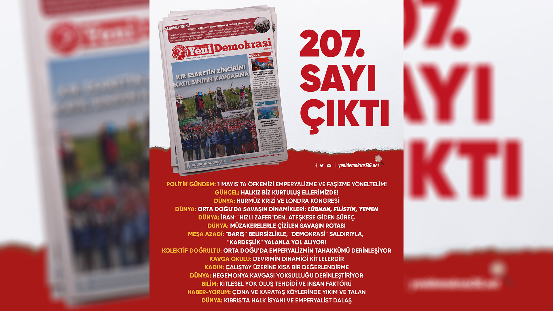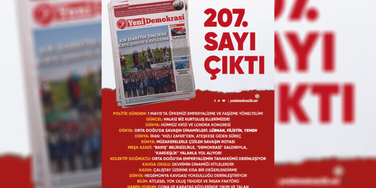 Gazetemiz Yeni Demokrasi’nin 207. sayısı “Kır Esaretin Zincirini, Katıl Sınıfın Kavgasına” manşetiyle çıktı. Gazetemize Umut Yayımcılık büroları, Kadıköy ve Taksim Mephisto Kitabevi’nden ulaşabilirsiniz.