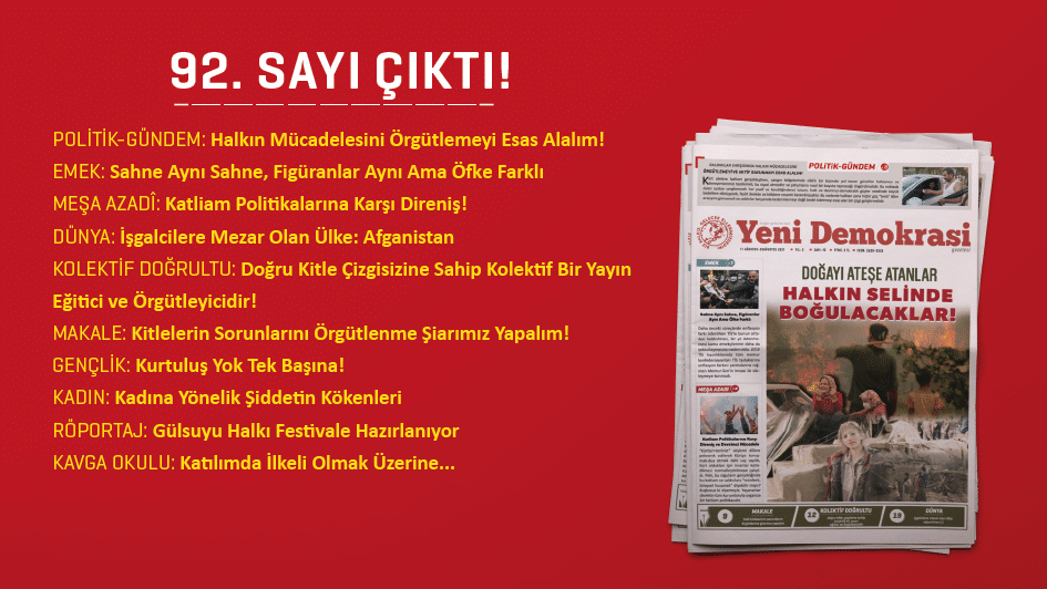 HABER MERKEZİ- Gazetemiz Yeni Demokrasi’nin 92. sayısı “Doğayı Ateşe Atanlar Halkın Selinde Boğulacaklar” manşetiyle çıktı.