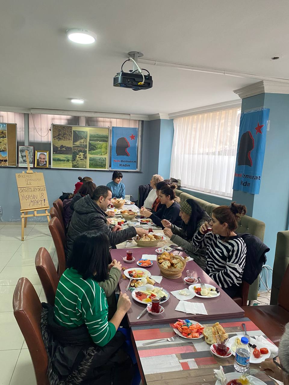 Yeni Demokrat Kadın’ın örgütlediği kahvaltı etkinliği Maraş depremlerinin yaratmış olduğu yıkım ve depremde kadınların karşılaştığı çok yönlü saldırıların gündem olduğu konuşmalar ile başladı. Kahvaltı sonrasında deprem bölgesine dayanışmaya giden kadınlar bölgedeki izlenimleri aktardılar. İzlenimler sonucunda deprem bölgelerinde sorunların hâlâ devam ettiğini vurgulandı. Dayanışmanın süreklileşmesiyle ilgili konuşan kadınlar örgütlenerek dayanışmanın büyütülmesi yönünde kararlar aldı.