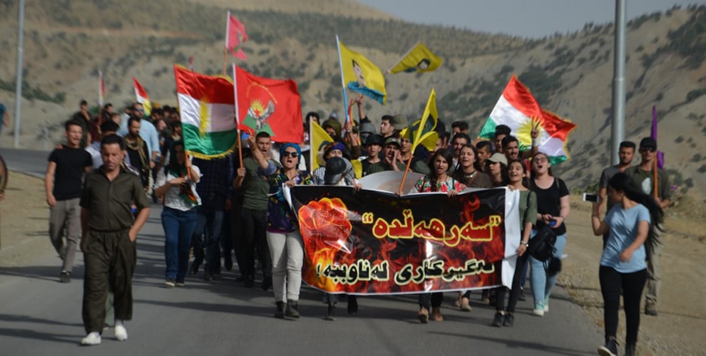 Dün Süleymaniye’deki Nalî Parkı’nda bir basın açıklaması düzenleyen gençler, Süleymaniye’nin Dukan ilçesinin ardından saat 15.00’da vardıkları Ranya’nın Senseger beldesinde eylem düzenledi.