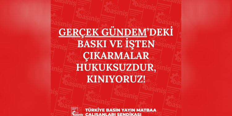 Gerçek Gündem’de yeni yönetimin gelmesinin ardından işten çıkarmalar ve mobbing yaşandığını açıklayan DİSK Basın-İş, “5 basın emekçisinin işine son verildi, 2 gazeteci ise istifaya zorlandı. Bazı çalışanların izinsiz 7 gün çalışmaya zorlandı. Emekçilerin yanında olduğumuzu ve her türlü hukuki desteğe hazır olduğumuzu bildiriyoruz” dedi.