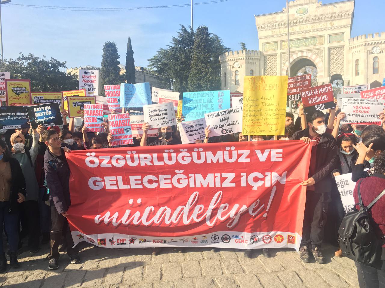 Beyazıt’ta bulunan İstanbul Üniversitesi’nin tarihi ana kapısı önünde bir araya gelen gençlik örgütleri, “Özgürlüğümüz ve geleceğimiz için mücadeleye” yazılı pankart açtı.