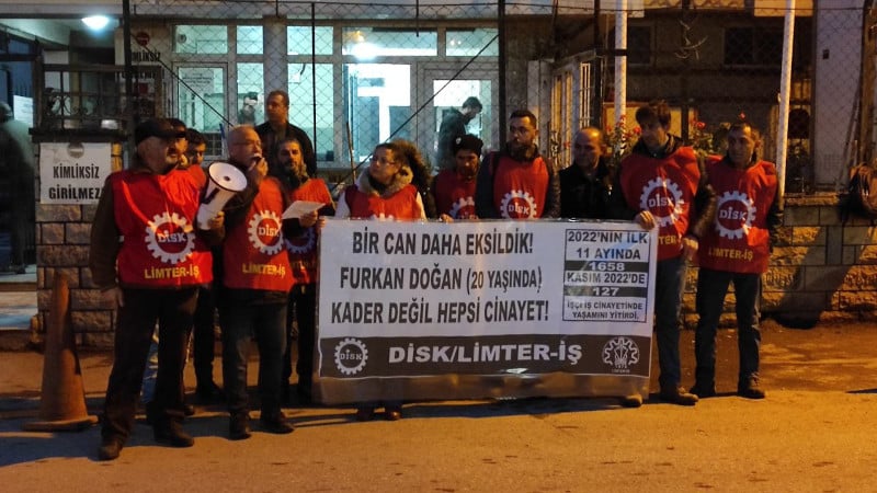 “Bir can daha eksildik! Furkan Doğan (20 yaşında) Kader değil hepsi cinayet. 2022’nin ilk 11 ayında 1658, Kasım 2022’de 127 işçi, iş cinayetinde yaşamını yitirdi” yazılı pankart açılan eylemde Limter-İş Genel Başkanı Kanber Saygılı basın metnini okudu.