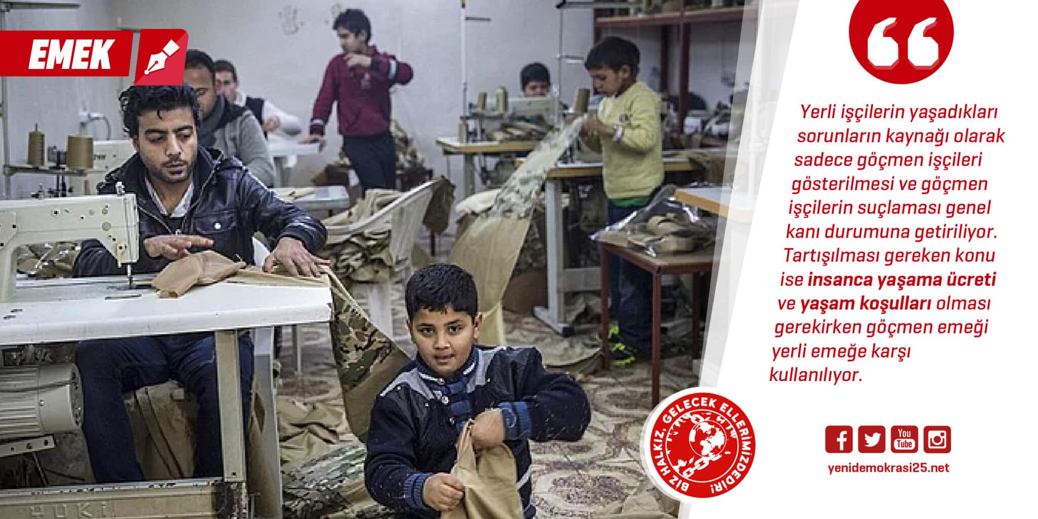 Göçmen emeğinin göç edilen ülke ekonomisi için yedek iş gücü kaynağı olarak görülmesi sermaye ve onun kuklaları ve iktidar temsilcilerinin “Suriyeliler giderse ülke ekonomisi çöker”, “Sanayiyi onlar ayakta tutuyor” gibi açıklamalar yapmalarının dayandığı noktalar üstünkörü yapılmış açıklamalar değil, göçmen emeğine sermayenin net bakışıdır. Çünkü emeğin güvencesiz, keyfi bir şekilde kullanılmasıyla ile sermayenin emek üzerindeki sömürüsünün giderek derinleşmesi doğru orantılıdır. Emek üzerindeki sömürü arttıkça çalışma koşulları başta ücret ve iş güvencesini yok ederek en derin görünümlerine kavuşur ve güvenceli istihdam biçimlerini yok ederek bütün işgücünü eğreti ve güvencesiz hale getirerek emeği ilkelleştirilir ve değersizleştir. Göçmen emeğinin sömürülmesi genel olarak sürdürülürken alt başlıklarda da bu sömürü tasarımının daha da derinden yaşanan kısımları da ayrıca önemlidir. Özellikle çocuk ve kadın emeği sömürüsündeki pervasızlık, sermayenin modern köleliğinin açık fotoğrafıdır. Özellikle son yıllarda Suriyeli kadınların ev içi parça başı emek piyasasına eklemlenmesinde etkili olan ve bu ev içinde çalışma pratiğini şekillendiren ve besleyen çeşitli süreç ve dinamikler bulunmaktadır. Bunları en genel hatlarıyla söz edersek: zorunlu göç, ataerkil pazarlık, mevcut kayıt dışı emek piyasasının genişliği ve esnekliği, mülteci deneyimine sahip olup yasal olarak geçici koruma statüsünde tanımlanma, ırkçılık ve şiddet korkusu, ev içi emek, çocuk-yaşlı-engelli bakımı olarak sıralanabilir. Günlük 50 lira yevmiyeye ayakkabı ve tekstilde çalışan çocuk işçiliği ne tesadüf ne de münferit bir durumdur. Bu şekilde çalışma zorunluluğu sermayenin kan emici ruhundan başka bir şey değildir.
