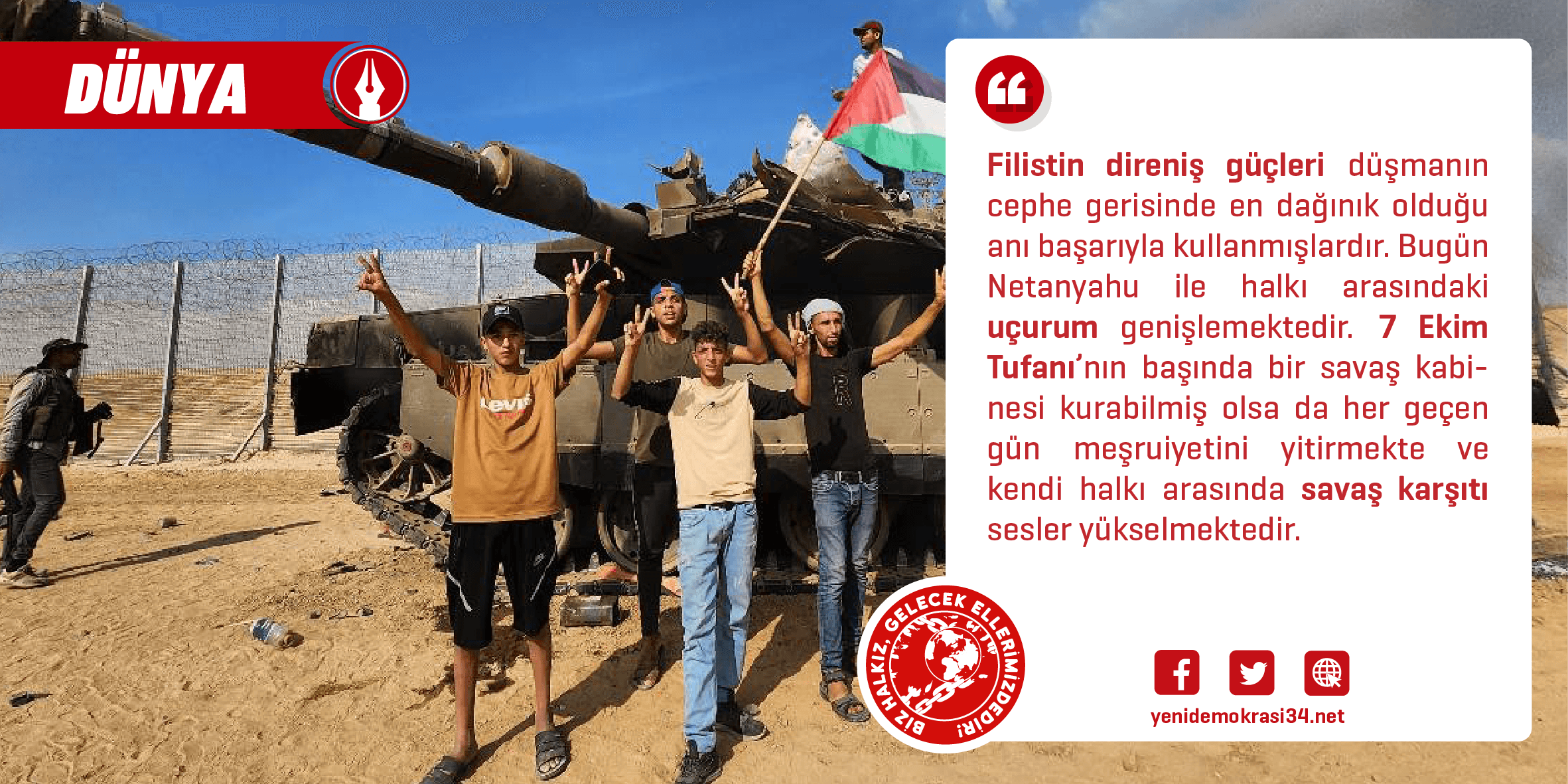 Gazze açık hava hapishanesinin etrafını saran çitler ve 7/24 izleme yapan gözetleme sistemleri 7 Ekim saldırısını engelleyemedi. Emperyalistlerin etrafını bir “efsane” halesi ile efsunladığı MOSSAD, saldırıya önlem alamadı. Orta Doğu’nun en modern ve pahalı ordusunun safları henüz ilk dakikalarda paramparça oldu. Maliyeti yaklaşık 3,5 milyon dolar olan “Merkava 4M” ana muharebe tankları, Hamas savaşçılarının kullandığı birkaç bin dolarlık araçlarla yok edildi… Ezen ulus egemenliğine karşı örülen, halka dayanan savaş çizgisi Orta Doğu’daki tüm hesapları altüst etti. Bilhassa NATO emperyalistlerinin ellerini ovuşturarak uzun süredir kurguladıkları Doğu Akdeniz doğal gaz projeleri ve boru hatları; Çin’in bölgeye dönük “Kuşak-Yol İnisiyatifi” ile somutlaşan kendi sosyal-emperyalist planları Filistin halkının şiddetli eylemi ile toz duman oldu. İbrahim Anlaşması süreçleri ile derinleşen Arap sermayesi ve Siyonist devlet yakınlaşmaları çöpe atıldı. Halkın ve örgütlü bir gücün “zor” kullanımı bir kez daha tarihin aksını değiştirdi.