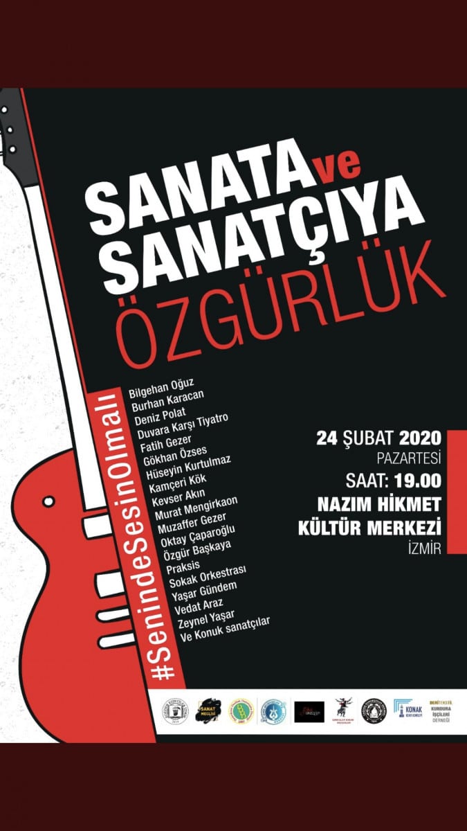 Grup Yorum üyeleri için 24 Şubat akşamı Konak’ta bulunan Nazım Hikmet Kültür Merkezi’nde düzenlenecek dayanışma konseri yasaklandı. Aralarında İzmir Müzisyenler Derneği üyelerinin de olduğu pek çok yerel sanatçının katılımıyla düzenlenecek dayanışma gecesi İzmir Valiliği tarafından yasaklandı.