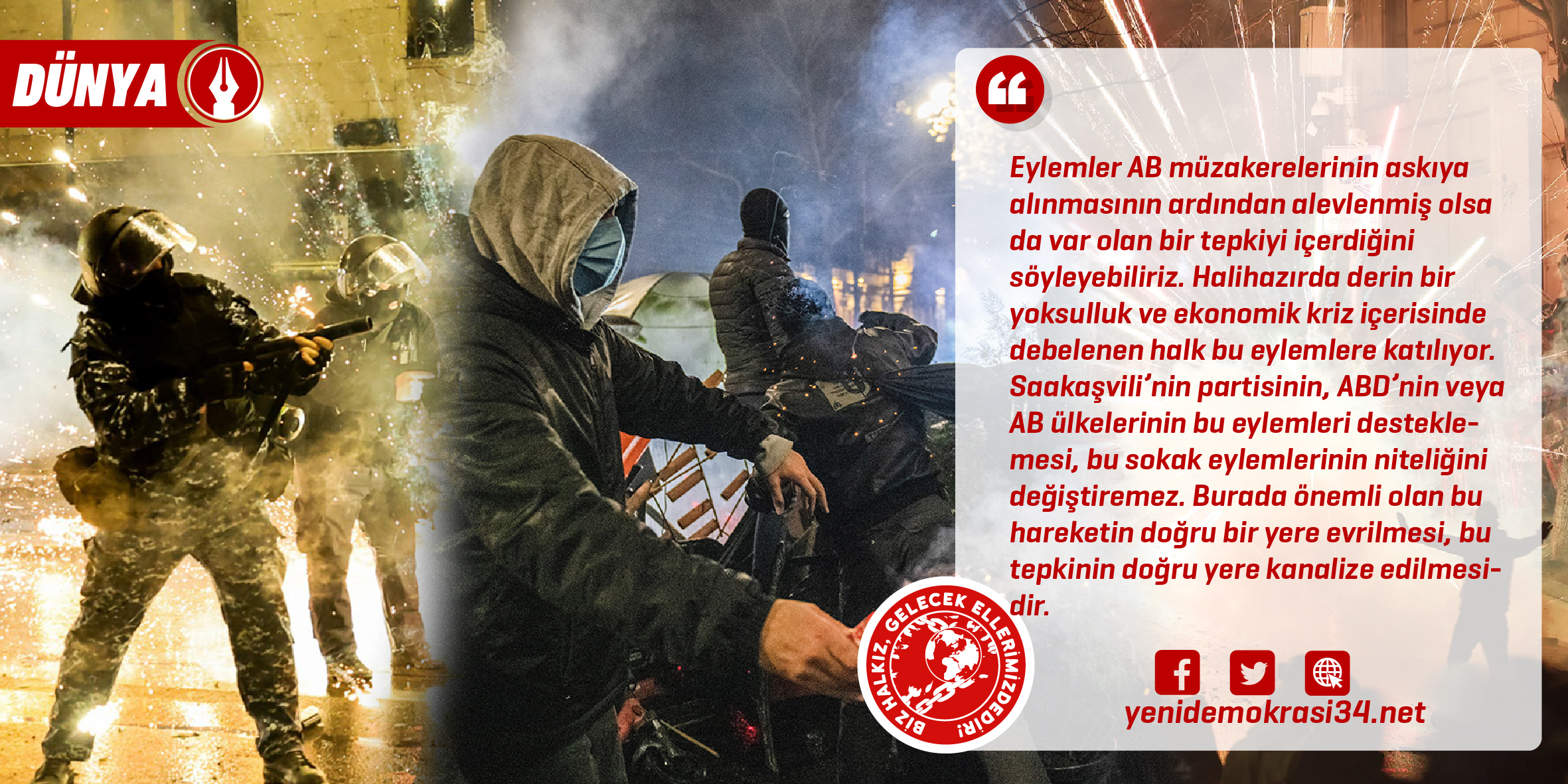 Gürcistan’da başlayan eylemler sönümlenerek devam ediyor. Eylemler AB müzakerelerinin askıya alınmasının ardından alevlenmiş olsa da var olan bir tepkiyi içerdiğini söyleyebiliriz. Halihazırda derin bir yoksulluk ve ekonomik kriz içerisinde debelenen halk bu eylemlere katılıyor. Saakaşvili’nin partisinin, ABD’nin veya AB ülkelerinin bu eylemleri desteklemesi, bu sokak eylemlerinin niteliğini değiştiremez. Burada önemli olan bu hareketin doğru bir yere evrilmesi, bu tepkinin doğru yere kanalize edilmesidir. Bu eylemlerin AB yanlılarını içermesi, eylemlerin meşru ve haklı olduğu gerçeğini değiştirmez. Gürcistan halkı yıllardır derin yoksullukla birlikte yozlaşmış, rüşvet çarkı içerisinde debelenen devlete karşı sokaklara dökülüyor. Bu eylemlere faşist partiler, liberaller rengini vermeye çalışıyor. Herhangi bir komünist/devrimci özneden yoksun bu eylemler içerisinde yoksulluğa karşı isyanı, karşı koyuşu barındırıyor. Ne “Rus yanlısı, Batı karşıtı” olarak adlandırılan iktidar ne “AB-NATO iş birlikçisi muhalefet” halkın hareketinin önüne geçecektir. Halkın deneyimleri devrimci öz ve özneyle buluşunca bu eylemler nitelikli hale gelecek ve büyüyecektir.