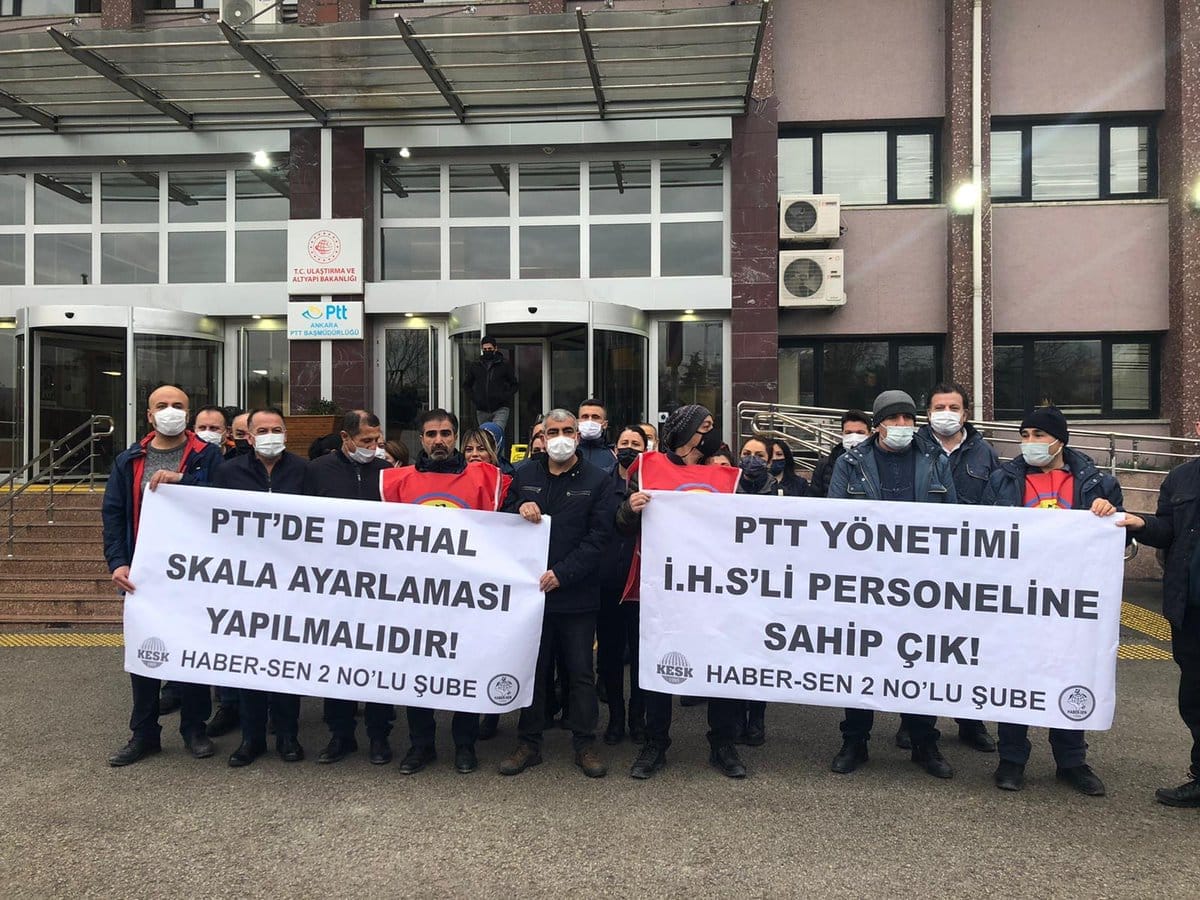 Basın Yayın İletişim ve Posta Emekçileri Sendikası (Haber-Sen), PTT’deki ücret dağılımına itiraz ederek bir kez daha “eşit işe eşit ücret” talebini dillendirerek İdari Hizmet Sözleşmeli (İHS) ve taşeron emekçilerinin aynı işi yaptıkları ancak farklı ücret aldıklarına dikkat çekti.