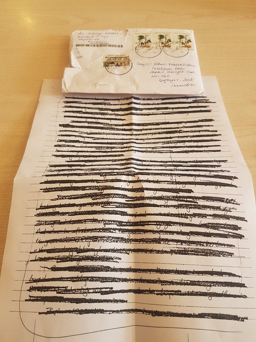 Karabük T Tipi Hapishanesi’nde tutsak bulunan Erden’in gönderdiği ve gardiyanlar tarafından “sakıncalı” bulunarak tamamının karalandığı mektubu gazeteci Gökçer Tahincioğlu sosyal medya hesabından paylaştı.