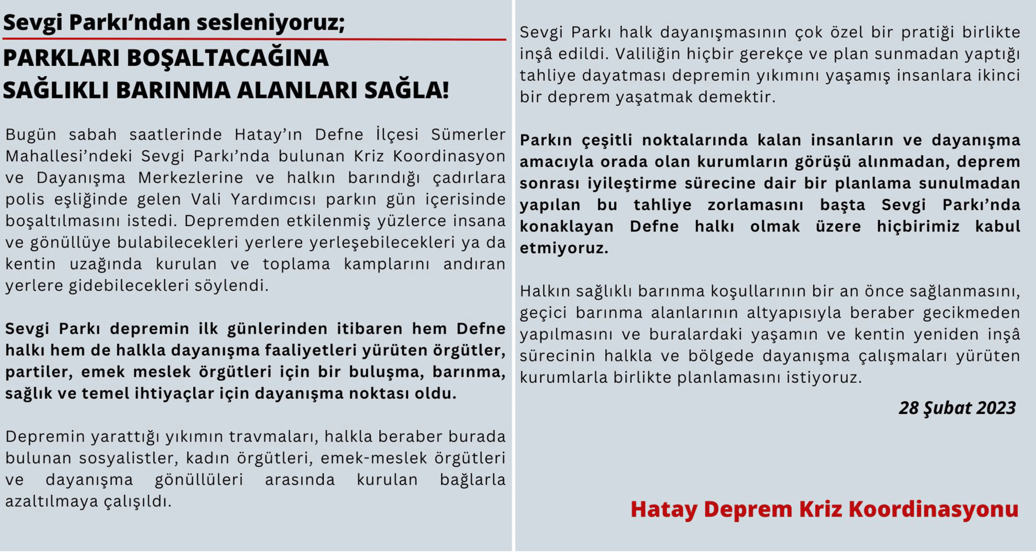 “Bugün sabah saatlerinde Hatay’ın Defne İlçesi Sümerler Mahallesi’ndeki Sevgi Parkı’nda bulunan Kriz Koordinasyon ve Dayanışma Merkezlerine ve halkın barındığı çadırlara polis eşliğinde gelen Vali Yardımcısı parkın gün içerisinde boşaltılmasını istedi. Depremden etkilenmiş yüzlerce insana ve gönüllüye bulabilecekleri yerlere yerleşebilecekleri ya da kentin uzağında kurulan ve toplama kamplarını andıran yerlere gidebilecekleri söylendi.