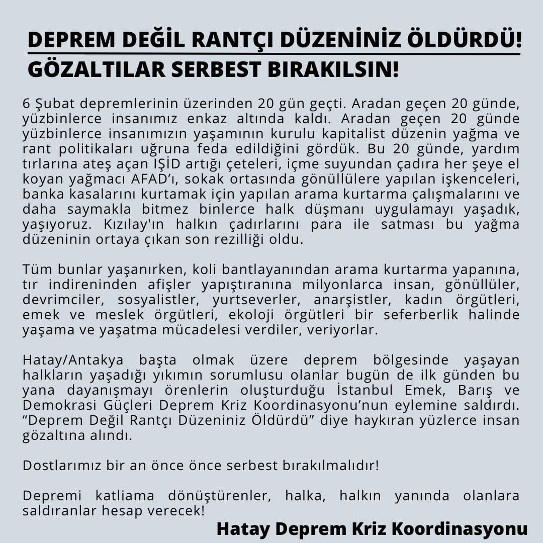 “Deprem Değil Rantçı Düzeniniz Öldürdü! Gözaltılar Serbest Bırakılsın!” başlığıyla yayımlanan açıklamanın tamamı şu şekilde: