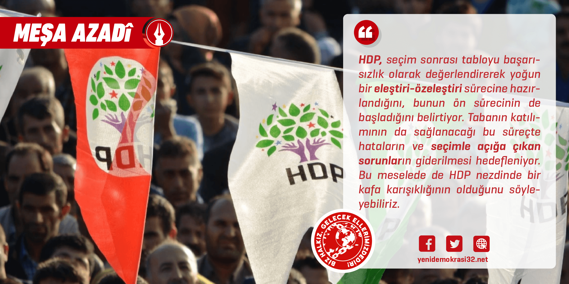 HDP’nin seçim tavrına ve seçim çalışmalarına dair getirilen esaslı eleştirilerden biri Kürtlerin ulusal haklarının seçime ve çalışmalara yansımayışı oldu. AKP-MHP faşist blokunun tüm cephelerde devreye koyduğu imha ve diz çöktürme hamlesi karşısında direnen, bedel ödeyen, tüm baskılara, zorla asimilasyon politikalarına karşı ulusal kimliğini ve mücadeleyi sahiplenen Kürt halkının getirdiği bu eleştiri kuşkusuz özeldir. Bu, seçimlere indirgenemeyecek denli ideolojik-politik bir yönelimin sonucudur. Türkiyelileşme olarak tanımlanan politik yönelim, uzunca bir süredir HDP’nin örgütlendiği ana doğrultudur. Kürt Ulusal Hareketinin paradigmasındaki değişimle oluşan bu doğrultunun bir sonucu olarak HDP yüzünü Türkiye Kürdistanı’nın ötesine çevirmiş, çok bileşenli bir yapı oluşturarak çalışmalarını genişletmiştir. Bu genişlemenin sonucunda HDP’ye çok sayıda liberal katılmıştır. Bu liberallerin çizgiye ve güncel politikalara müdahale alanlarının gelişmesiyle HDP’ye ilgileri daha da artmış eş başkanlık dahil önemli kademelerde görevler alacak denli HDP ile birleşmişlerdir. KUH’un çizgisinin özellikle de legal alanda “en geniş” kesimleri de içerebilecek bir öze sahip olması bu liberallerle yol yürümeye olanak tanımaktadır. HDP’nin politikalarının ana eksenini zaten uzunca bir süredir Türkiye’nin demokratikleştirilmesi sorunu oluşturuyor. Bu doğrultuda “demokratik cumhuriyet”, “ortak yaşam” vb. bir dizi söyleme geçiş yapıldığını gördük. Önce özgürce ayrılma hakkını salt ayrılmak, yani devlet kurmak için mücadele olarak kavrayan KUH hızlı bir değişimle bağımsızlık hedefinden vazgeçip “özgür bir ortak yaşam” idealine sarıldı. HDP de bu idealin kurucu öznesi olarak örgütlenmeye başladı. Seçim kampanyasında öne çıkan anlayış da bu oldu. Kesk, sor û zer’in yerini daha “renkli” bir bayrak aldı.