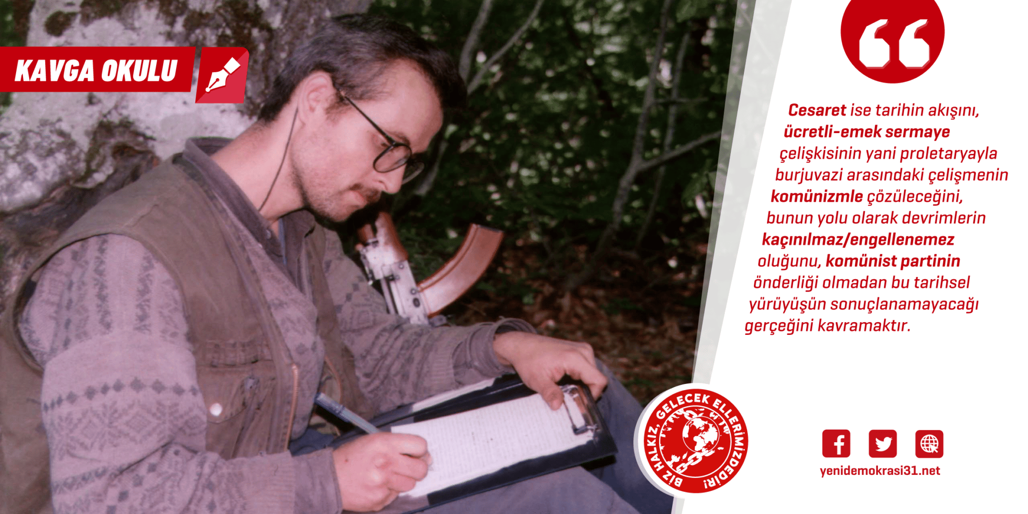 Kim kendisiyle cebelleşir, hantallığını, bencilliğini, dedikoducu tarzını, rutin görevlerle sınırlı devrimcilik anlayışını sorun eder; kim cüretsizliği, titrekliği, iddiasızlığı sorun eder; kim halka, yoldaşlarına karşı sevgisizliğini, sekterliğini; kim üretimsizliğini, şiirden, türküden, romandan, espriden fersah fersah kaçışını sorun eder; kısacası gelişmişliği, niteliği düşük olan devrimciliğini sorun eder? Cevaplayalım! Cesareti olan, çatışma gücünü kendinde bulan sorun eder. Cesaret ise tarihin akışını, ücretli-emek sermaye çelişkisinin yani proletaryayla burjuvazi arasındaki çelişmenin komünizmle çözüleceğini, bunun yolu olarak devrimlerin kaçınılmaz/engellenemez oluğunu, komünist partinin önderliği olmadan bu tarihsel yürüyüşün sonuçlanamayacağı gerçeğini kavramaktır. Bu kavrayış bizi kendimizde, yoldaşlarımızda ve KP’mizdeki hatalara karşı mücadele etmeye, eleştiri-birlik-eleştiri ilkesini pratiğinde parlatmaya götürür.