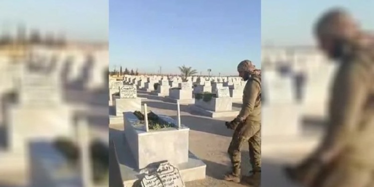 Saldırıya ait görüntüler, Rojava’da faaliyet yürüten haber kanallarının Telegram hesaplarından paylaşıldı. Görüntülerde, HTŞ’li çetelerden birinin mezar taşlarını tek tek kırdığı ve yaşamını yitiren savaşçılara hakaret ettiği görülüyor.