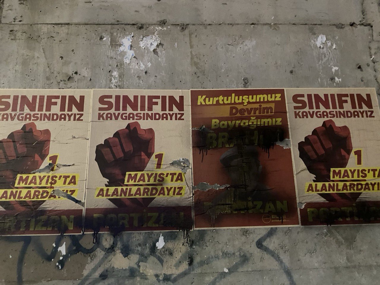 Partizan’ın 1 Mayıs çalışmaları kapsamında yaptığı, İbrahim Kaypakkaya’nın fotoğrafının bulunduğu afişler sprey boyayla kapatılmaya çalışıldı. Kartal ve Kadıköy’deki duvarlarda diğer siyasî kurum ve partilerin afişlerine zarar verilmediği görülürken Partizan’ın afişlerindeki İbrahim silüetleri ve Partizan imzalarının sprey boyayla kapatıldığı, bazı afişlerin de duvardan sökülmeye çalışıldığı görüldü.