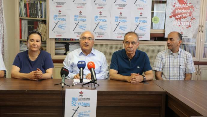 HABER MERKEZİ- 17 Temmuz 1986 tarihinde 98 kişinin imzasıyla kurulan İnsan Hakları Derneği’nin (İHD) 32’nci kuruluş yıl dönümü nedeniyle İHD Genel Merkezi’nde basın toplantısı düzenlendi. Toplantıya İHD’nin eski başkanları ve mevcut Merkez Yürütme Kurulu (MYK) üyeleri katıldı.