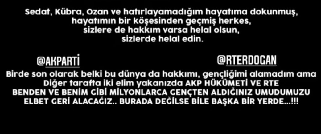 Antalya’da oturan İhsan Bekkaya, sosyal medyada arkadaşlarına veda mesajı yayınladıktan sonra oturduğu apartmanın 5’inci kat penceresinden atlayarak yaşamına son verdi. Mesajda AKP ve Tayyip Erdoğanı etiketleyerek “Bir de son olarak belki bu dünya da hakkımı, gençliğimi alamadım ama diğer tarafta iki elim yakanızda. AKP hükümeti ve RTE benden ve benim gibi milyonlarca gençten aldığınız umudumuzu elbet geri alacağız… Burada değilse bile bir başka yerde!” dedi. İntiharın dün (24 Mayıs) saat 19.00 sıralarında Kepez ilçesi Düdenbaşı Mahallesi’nde gerçekleştiği öğrenildi.