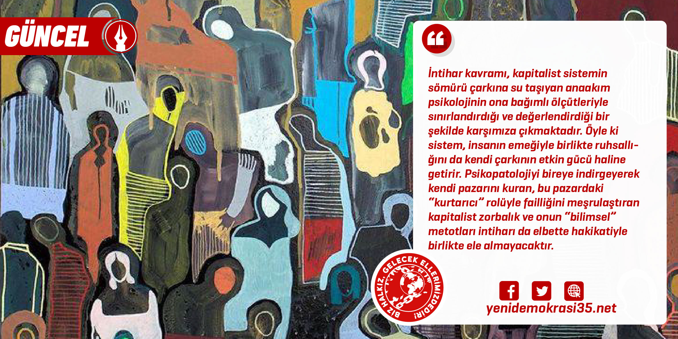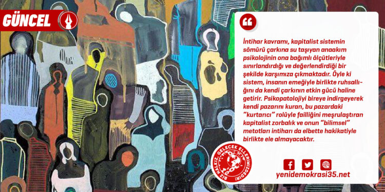 İntihar kavramı, kapitalist sistemin sömürü çarkına su taşıyan anaakım psikolojinin ona bağımlı ölçütleriyle sınırlandırdığı ve değerlendirdiği bir şekilde karşımıza çıkmaktadır. Öyle ki sistem, insanın emeğiyle birlikte ruhsallığını da kendi çarkının etkin gücü haline getirir. Psikopatolojiyi bireye indirgeyerek kendi pazarını kuran, bu pazardaki “kurtarıcı” rolüyle failliğini meşrulaştıran kapitalist zorbalık ve onun “bilimsel” metotları intiharı da elbette hakikatiyle birlikte ele almayacaktır.
