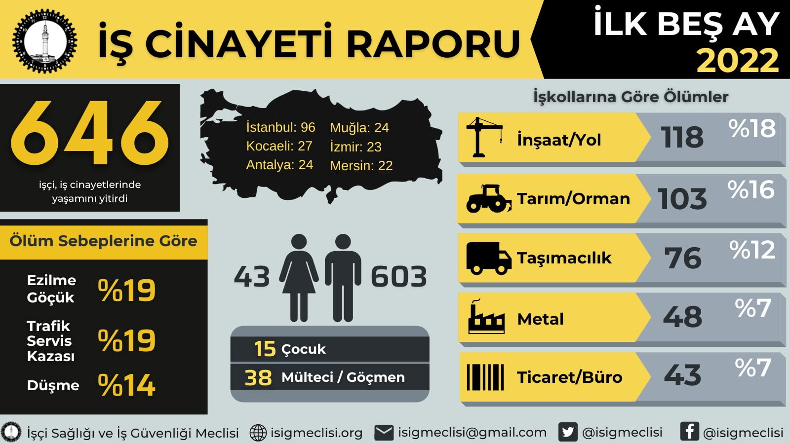 “2022 yılının ilk beş ayında Türkiye’nin 73 şehrinde ve yurtdışında on bir ülkede iş cinayeti gerçekleştiğini tespit ettik: 96 ölüm İstanbul’da; 27 ölüm Kocaeli’nde; 24’er ölüm Antalya ve Muğla’da; 23 ölüm İzmir’de; 22 ölüm Mersin’de; 21’er ölüm Bursa ve Manisa’da; 19 ölüm Denizli’de; 18’er ölüm Aydın ve Kayseri’de; 17 ölüm Ankara’da; 16’şar ölüm Gaziantep ve Samsun’da; 15’şer ölüm Konya ve Şanlıurfa’da; 12 ölüm Adana’da; 10’ar ölüm Malatya ve Zonguldak’ta; 9’ar ölüm Balıkesir ve Sakarya’da; 8 ölüm Çanakkale’de; 7’şer ölüm Batman, Hatay ve Kahramanmaraş’ta; 6’şar ölüm Bolu, Eskişehir, Mardin, Sivas ve Trabzon’da; 5’er ölüm Adıyaman, Ağrı, Bilecik, Çorum, Kütahya, Tekirdağ ve Uşak’ta; 4’er ölüm Diyarbakır, Düzce, Erzurum, Karabük, Kırıkkale, Kırşehir, Ordu, Rize, Sinop ve Yalova’da; 3’er ölüm Artvin, Burdur, Çankırı, Giresun, Kastamonu, Nevşehir, Niğde, Siirt ve Tokat’ta; 2’şer ölüm Afyon, Bartın, Edirne, Hakkari, Iğdır, Kars, Kırklareli, Osmaniye, Şırnak ve Van’da; 1’er ölüm Aksaray, Ardahan, Bayburt, Elazığ, Isparta, Karaman ve Kilis’te; 16 ölüm yurtdışında (3’er Irak ve Kuzey Kıbrıs; 2 Rusya; 1’er Azerbaycan, Çin, Dominik, İsrail, Libya, Makedonya, Malta, S.Arabistan) meydana geldi…”