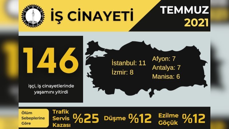 İSİG raporuna göre Temmuz ayında en az 146 işçi, 2021 yılının ilk yedi ayında ise en az 1301 işçi yaşamını yitirdi. İş cinayetlerinin aylara göre dağılımına bakıldığında; Ocak ayında en az 203 işçi, Şubat ayında en az 142 işçi, Mart ayında en az 144 işçi, Nisan ayında en az 257 işçi, Mayıs ayında en az 236 işçi, Haziran ayında en az 173 işçi, Temmuz ayında en az 146 işçi hayatını kaybetti.