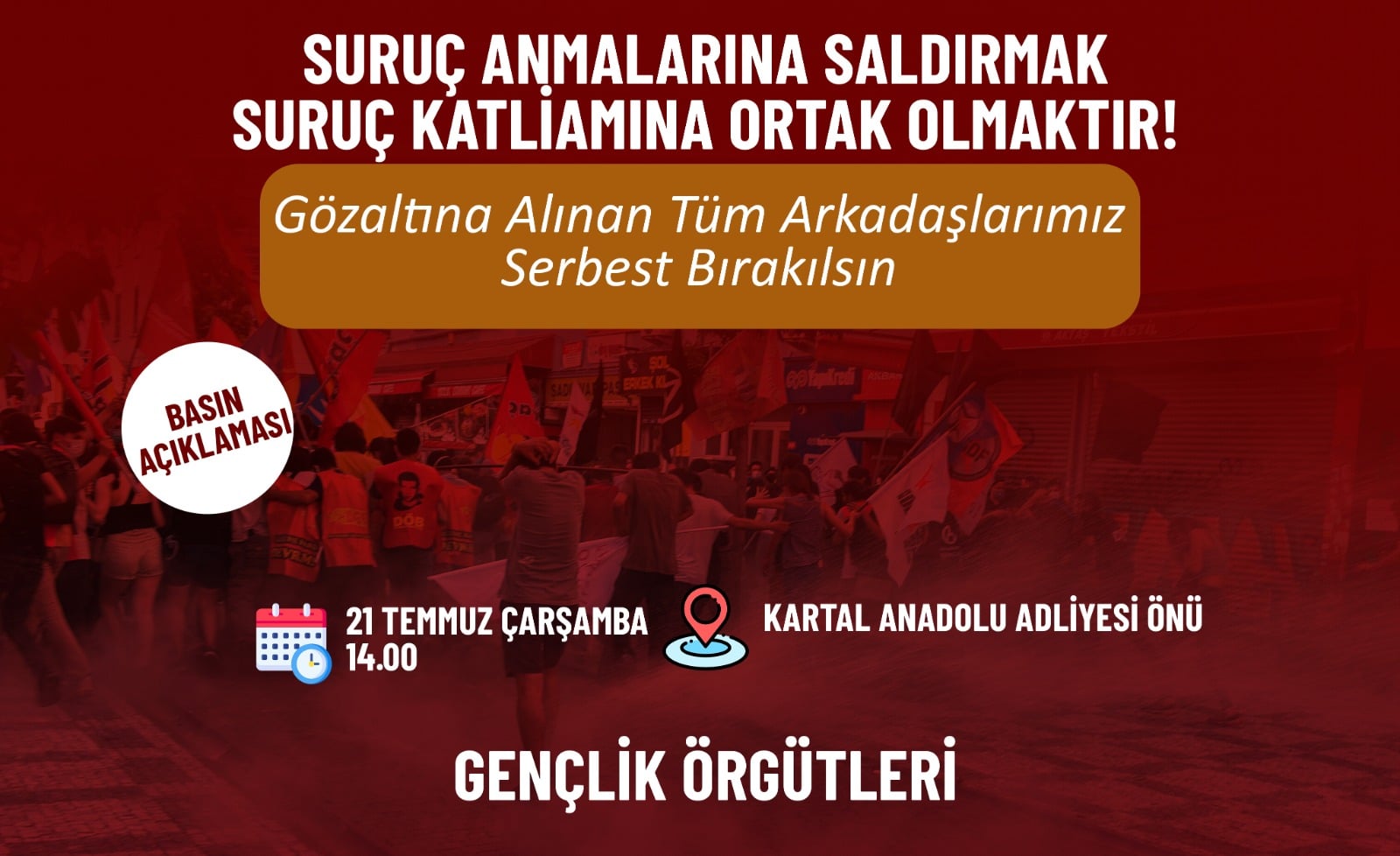 HABER MERKEZİ- Dün Suruç Katliamı eyleminde işkenceyle gözaltına alınıp bugün adliyeye sevk edilen 12 devrimci için gençlik örgütleri tarafından bugün saat 14:00’da Kartal Anadolu Adliyesi önünde basın açıklaması gerçekleştirilecek.