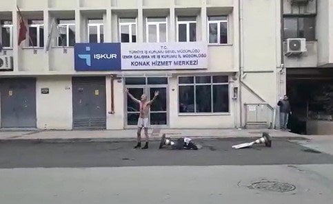 HABER MERKEZİ- İzmir Çalışma ve İş Kurumu İl Müdürlüğü (İŞKUR) önüne giden Battal Sağır isimli işçi, üzerindeki kıyafetleri bina önüne fırlatarak isyan etti.