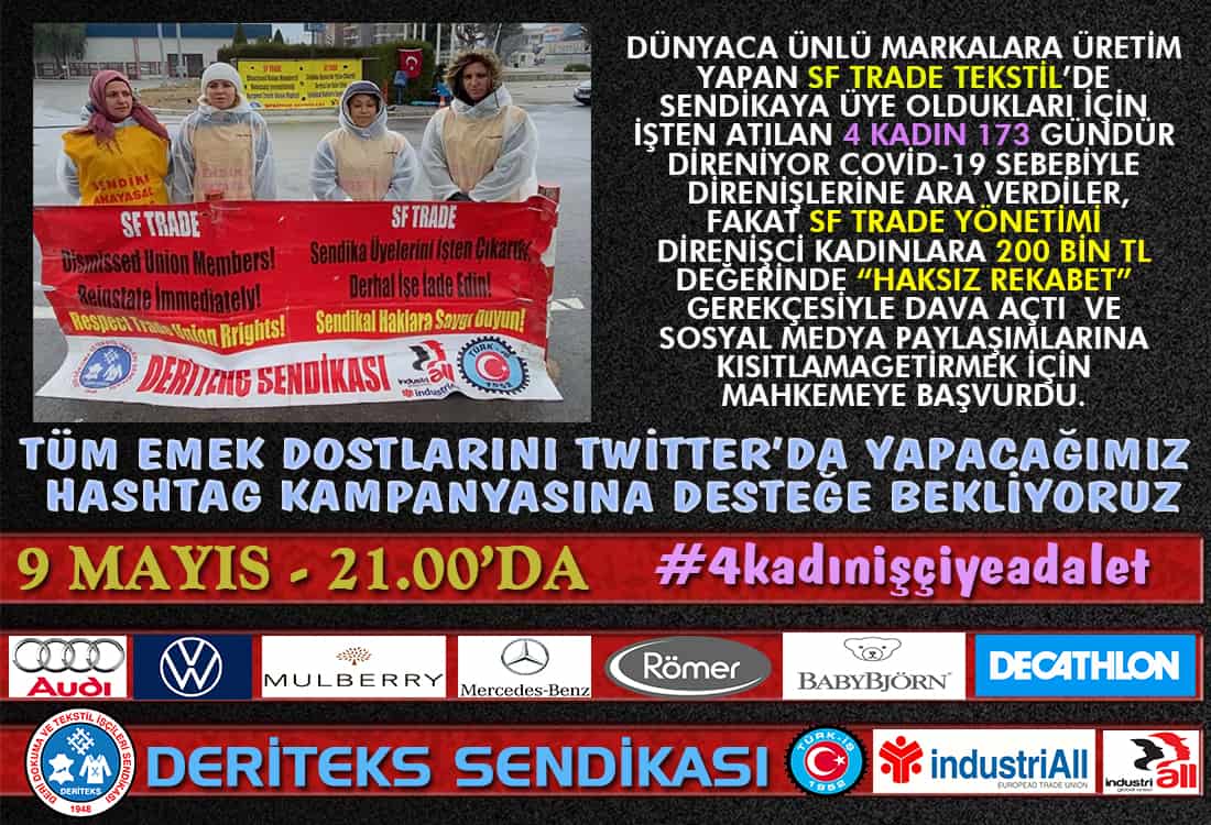 Anayasal haklarını kullanarak sendikaya üye olan dört kadın, bir yandan hukuk mücadelelerini, bir yanda da direnişlerini sürdürüyor. Uluslararası markaların üretim üslerinden biri olan SF Trade Tekstil’de davranış kuralları ve Anayasa ve uluslararası sözleşmeler ile güvence altına alınmış işçi hakları işverence ihlal ediliyor. Deriteks Sendikası üyesi kadın işçiler ise direnişlerini sürdürüyor.