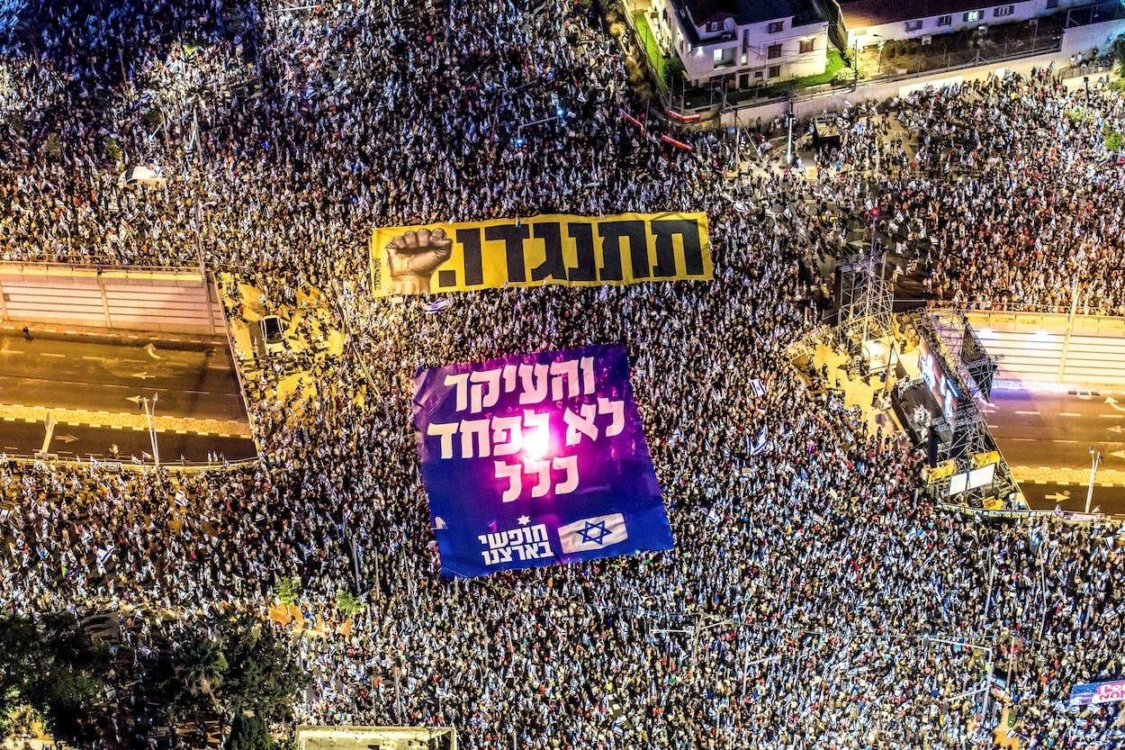 Her hafta olduğu gibi en yoğun katılımlı gösteriye ev sahipliği yapan Tel Aviv’de on binlerce protestocu, Kaplan Caddesi’ndeki Hükümet Kompleksi’nin önünde toplandı.
