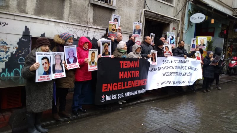 İHD İstanbul Şubesi, 567’nci F oturmasını Beyoğlu’nda bulunan şube binası önünde düzenledi. “Tedavi Haktır Engellenemez”, “Hasta Mahpus Muhlise Karagüzel Serbest Bırakılsın” pankartının açıldığı eylemde basın açıklamasını Hatice Onaran okudu.