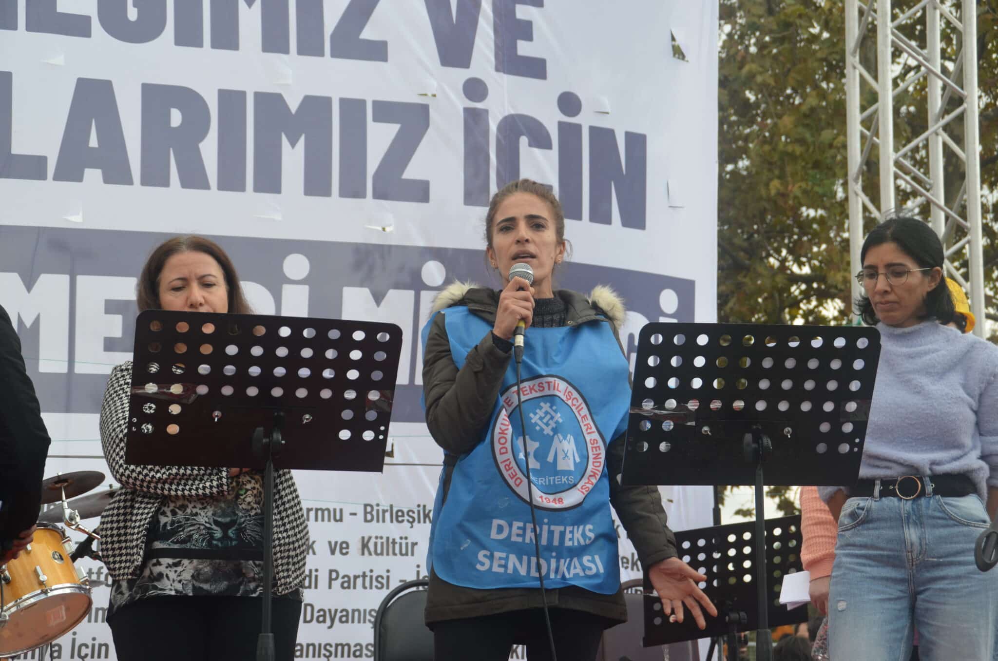 Mitingi düzenleyen kurumlar adına ortak metni ETF direnişçisi Ayşe Uyan okudu. Uyan sözlerine Bartın’da katledilen maden işçilerini anarak başladı. AKP-MHP iktidarı ve sermayenin kendi yarattıkları krizin faturasını işçi ve emekçilerin sırtına yüklemeye çalıştığını kaydeden Uyan, “Bu topraklarda eşitlik, özgürlük, sosyalizm mücadelesini büyütenler var” dedi.