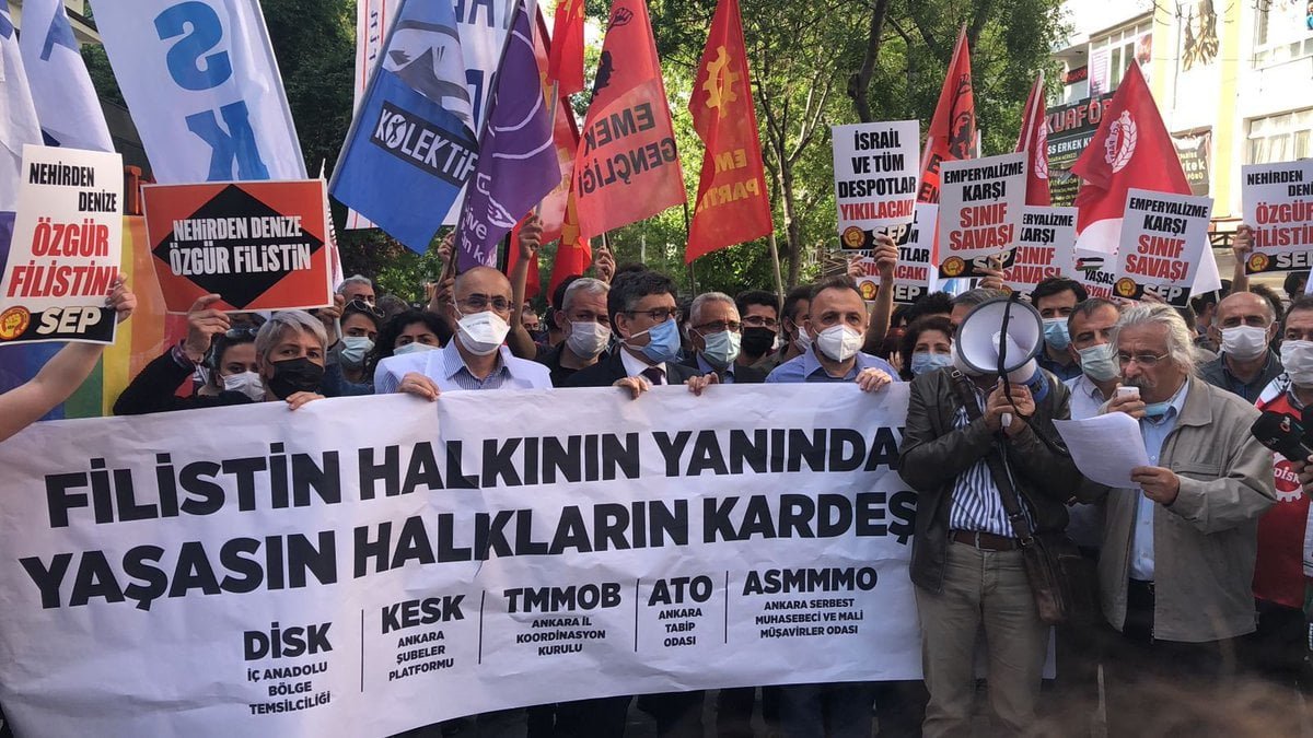 Ankara’da bir araya gelen Emek ve Demokrasi güçleri, sendikalar, devrimci demokrat kurumlar ve kadın örgütleri, İsrail’in Filistin’e yönelik saldırılarına dair basın açıklaması düzenledi. Sakarya Caddesi’nde yapılması planlanan açıklamaya polis, “Açıklamayı neden İsrail Konsolosluğu’nun önünde yapmıyorsunuz?” diyerek engelledi. Sakarya Caddesi’nden Selanik Sokağı’na yürüyen kitle, açıklamayı Kamu Emekçileri Sendikaları Konfederasyonu (KESK) Genel Merkezi önünde gerçekleştirdi. Açıklamada konuşma yapan KESK Şubeler Platformu Dönem Sözcüsü Hüseyin Köklü, İsrail’in Filistin’e dönük saldırılarını ve şu ana kadar 58’i çocuk olmak üzere 192 Filistinlinin yaşamını yitirdiğini hatırlattı.