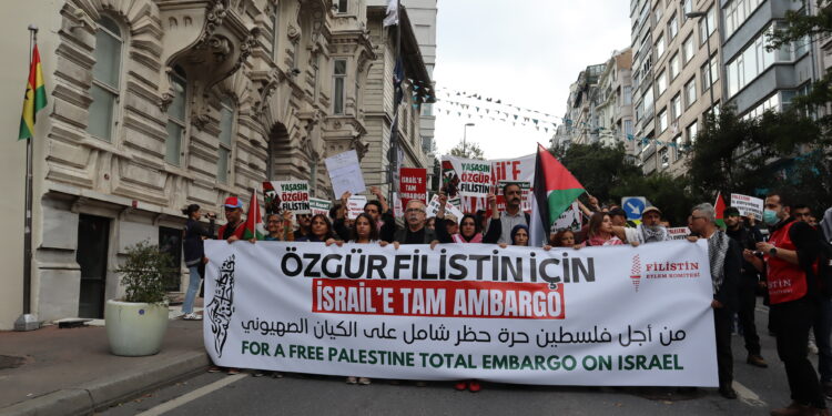 “Özgür Filistin için İsrail’e Tam Ambargo” ana pankartı arkasında toplanan binler, kortejler halinde Taksim Atatürk Kültür Merkezi’nden Dolmabahçe’ye yürüdü. Yürüyüş boyunca Filistin bayrakları, “Nehirden Denize Özgür Filistin”, “İsrail’e Tam Ambargo”, “Yaşasın Özgür Filistin” dövizleri taşındı.