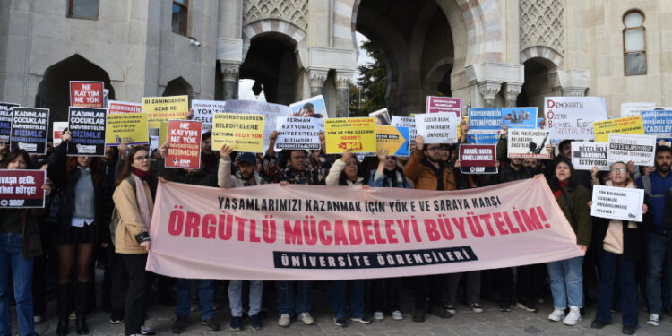 Üniversite öğrencileri, Yükseköğretim Kurulu’nun (YÖK) kuruluşunun 43. yıldönümünde Beyazıt Meydanında yan yana geldi. “Yaşamlarımızı Kazanmak İçin YÖK’e ve Saraya Karşı Mücadeleyi Büyütelim” pankartı açılan eylemde, “YÖK Kalkacak, Özgürlük Mücadelemizle Gelecek”, “Savaşa Değil Eğitime Bütçe”, “Nitelikli Barınma İstiyoruz”, “Üniversitelerden Belediyelere Kayyuma Geçit Yok”, “Bu Düzende Nefes Alamıyoruz, Yaşamak İstiyoruz” dövizleri ve intihara sürüklenen, ihmaller sonucu katledilen üniversite öğrencilerinin fotoğrafları taşındı.