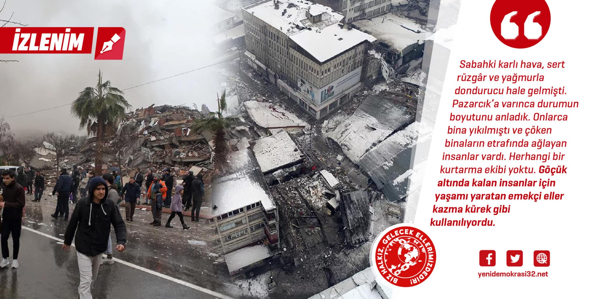 Sabahki karlı hava, sert rüzgâr ve yağmurla dondurucu hale gelmişti. Pazarcık’a varınca durumun boyutunu anladık. Onlarca bina yıkılmıştı ve çöken binaların etrafında ağlayan insanlar vardı. Herhangi bir kurtarma ekibi yoktu. Göçük altında kalan insanlar için yaşamı yaratan emekçi eller kazma kürek gibi kullanılıyordu. Polisler ise enkaz üzerinde çalışma yapan halktan, enkaz altında kalan insanların sayısını alıp gidiyordu. Yani faşizmin gözünde sadece “sayı”dan ibaretti halkımız! Enkaz altından gelen seslere yönelip elimizdeki imkanlar dahilinde müdahalede bulunmaya çalışıyorduk. Enkaz altından gelen her ses, bir süre sonra kesiliyordu. Halkımız kendi imkanlarıyla, devletin sorumlusu olduğu enkazla mücadele ediyordu. Pazarcık’ta birçok bina sadece kâr hırsıyla, zemin kontrolü yapılmadan, herhangi bir denetim olmadan yapılmış ve enkaza dönüşmüştü. Depremin merkez üssü olan Pazarcık’a AFAD ekipleri öğleden sonra ulaşabildi. İki ekip gelmişti ve toplamda 15 kişi kadardılar. Binalar ana yola devrilmişti, bundan kaynaklı trafik vardı ve devletin sürekli övdüğü yollar bozulmuştu. Biz Pazarcık’tayken ikinci deprem yaşandı. Zar zor ayakta kalan hasarlı binalar ikinci depremde çöktü. Soğuktan korunmak için molozlardan topladıkları tahta parçalarını yakarak ısınan insanlar vardı. Daha sonra Gölbaşı istikametine doğru yola koyulduk. Gölbaşı’nın durumu da Pazarcık’tan farklı değildi. Yarım-yamalak çeken şebekeyle ulaşabildiğimiz insanlardan bilgiler alıp Adıyaman’a gitmek için oto-stop çektik. Bir araç durdu ve bizi aldı. Aracı süren kişi Ankara’dan, yakınlarından haber alamayan ve Adıyaman’a yardım için erzak getiren, araç park yerlerinde çalışan bir işçiydi. Yollarda ulaşım çok zordu, devletin öve öve bitiremediği dayanıklı yollar(!) yarılmıştı. Adıyaman’da da durum kötüydü, yüzlerce enkaz vardı ve halkımız kendi imkanları ile göçüklerin altında kalan insanları çıkarmak için canla başla çalışıyordu.