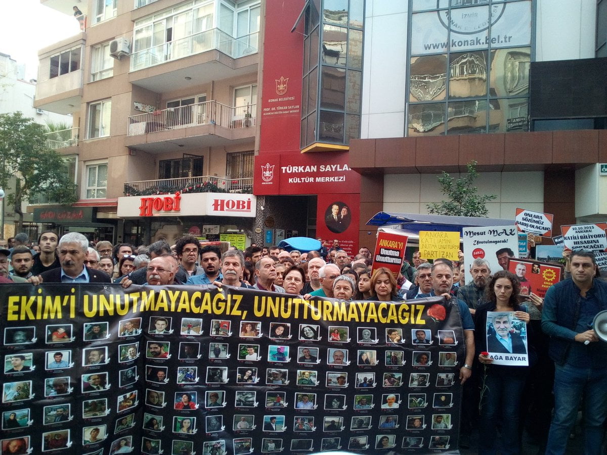 Alsancak Türkan Saylan Kültür Merkezi önünde 10 Ekim Ankara Katliamı’nda yaşamını yitirenler için anma düzenlendi. Anmaya birçok siyasi parti ve sendika temsilcileri ile katliamda yaşamını yitirenlerin aileleri de katıldı. Anmada, “Faşizme ölüm, halka hürriyet”, “Onlara sözümüz barış gelecek” sloganları atıldı.