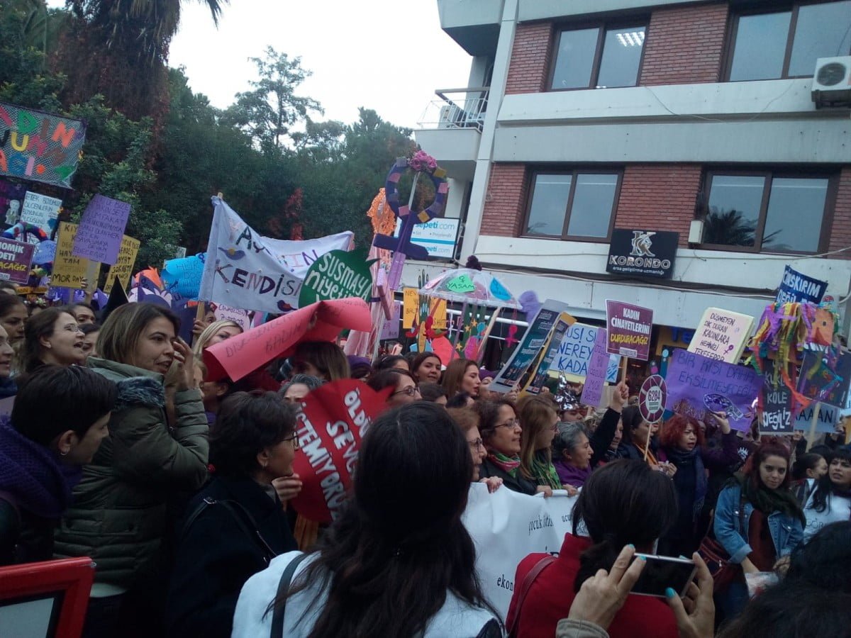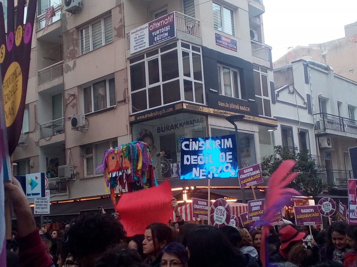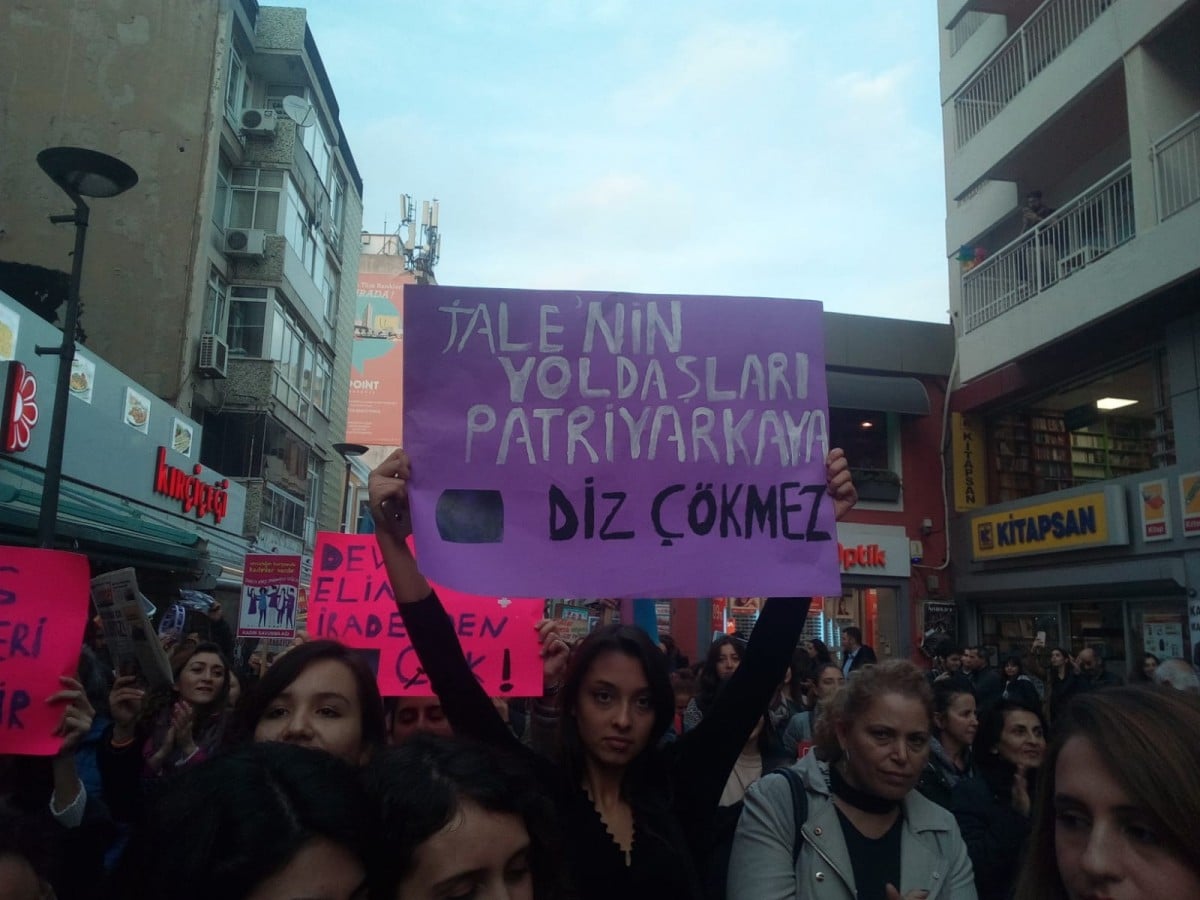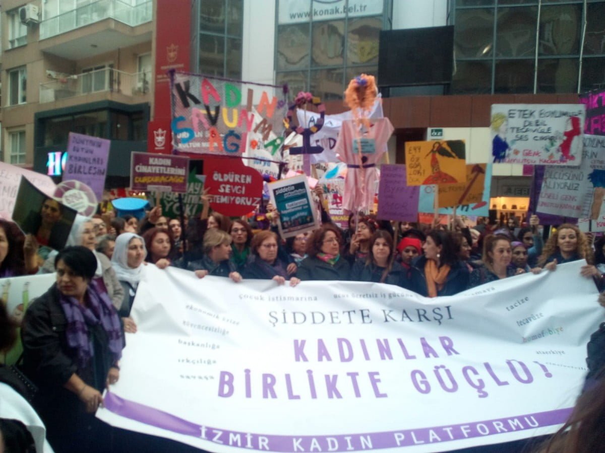 Türkan Saylan Kültür Merkezi önüne gelindiğinde İzmir Kadın Platformu adına basın açıklaması yapıldı. 25 Kasım’ın kısa tarihçesinin anlatıldığı açıklamada, erkek egemen zihniyetin kadına uyguladığı şiddete değinilerek, “töre”, “namus” adı altında kadınların katledildiği vurgulandı. Devletin failleri cezalandırmamasının teşhir edildiği açıklamada, AKP iktidarının kadınlara yönelik gerici politikalarına işaret edilerek bu dönemde artan kadın cinayetlerine dikkat çekildi. Konuşmanın devamında “kadınlar sokakta, mücadelede” denilerek, direnen kadınlar selamlandı.