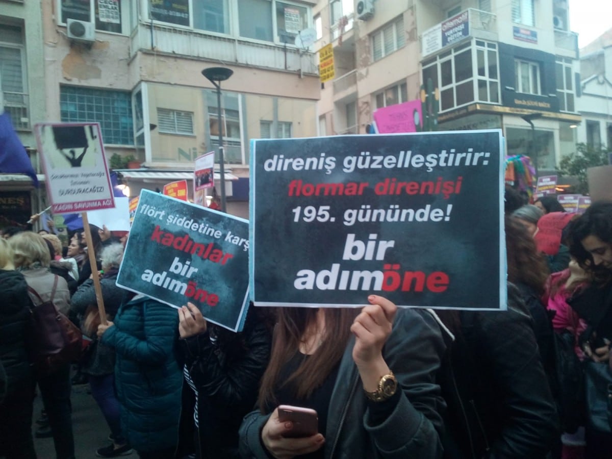 İZMİR- İzmir Kadın Platformu’nun çağrısıyla saat 17.00’de Alsancak ÖSYM bürosu önünde bir araya gelen kadınlar, Alsancak Türkan Saylan Kültür Merkezi önüne doğru yürüyüşe geçtiler. YDK ve YDG’li kadınların da katıldığı yürüyüş boyunca sık sık “Kadın cinayetleri politiktir!”, “Kadınlar sokağa eyleme özgürleşmeye!”, “Kadın yaşam özgürlük!”, “Flormar işçisi yalnız değildir!”, “Jin jiyan azadi!” sloganları haykırıldı.