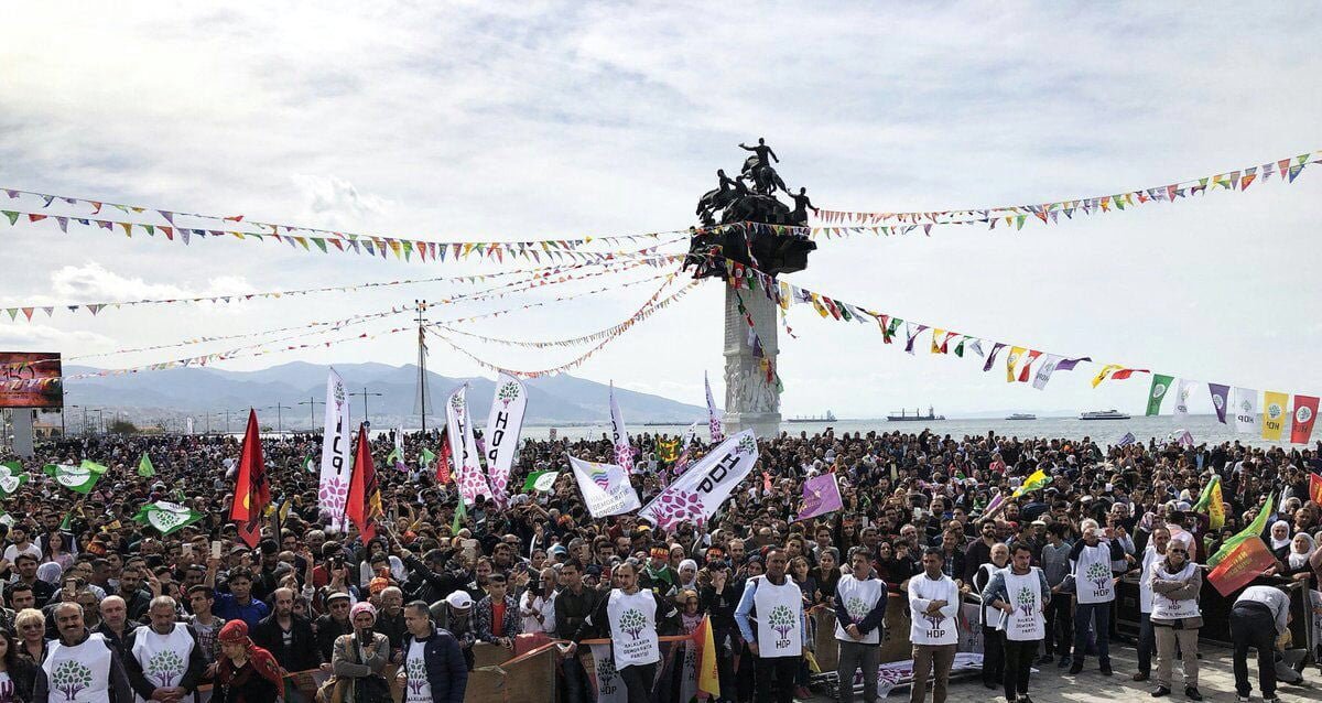 İzmir’de sabah saatlerinden itibaren ilçelerden gelen yurttaşlar, tüm engellemelere rağmen Gündoğdu Meydanı’na ulaştı. Alanı dolduran binlerce kişi halayların ve sloganların ardından özgürlük ve demokrasi mücadelesinde yaşamını yitirenler anısına saygı duruşunda bulundu. Binler hep bir ağızdan “Çerxa Şoreşê” marşını okudu. Ardından alkışlar eşliğinde hep bir ağızdan “Bijî berxwedana Efrinê” sloganı atıldı. Kitlenin “Bijî Newroz”, “Biji berxwedana Newrozê”, “Bijî Serok Apo”, “Her yer Efrin her yer direniş” ve “Bijî berxwedana Efrinê” sloganları birbirine karıştı.