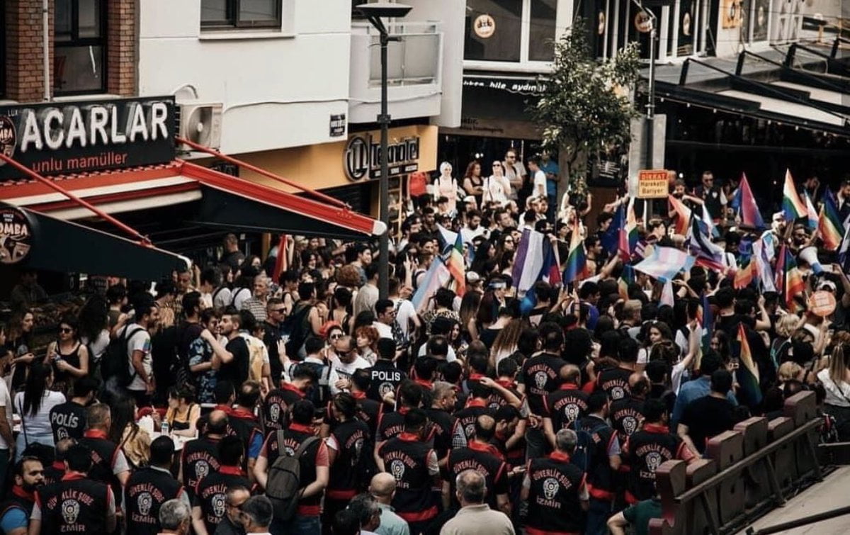 HABER MERKEZİ- İzmir’de bu yıl 7’ncisi düzenlenen LGBTİ+ Onur Haftası’nda İzmir Alsancak’ta toplanan kitlenin yürümesine polis izin vermedi. “Direne direne kazanacağız”, “Susma haykır, translar vardır” ve “Trans cinayetleri politiktir” sloganlarının atıldığı eylemde, polis kitlenin etrafını çevirerek yürüyüşe saldırdı. Eylem için alana gelenler de polisler tarafından engellenmeye çalışıldı.