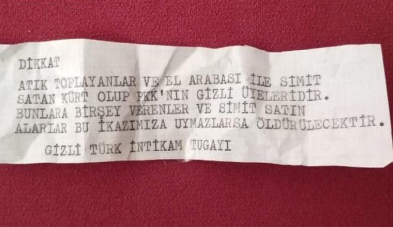 Mesajda, “Dikkat, atık toplayanlar ve el arabası ile simit satan Kürt olup PKK’nın gizli üyeleridir. Bunlara bir şey verenler ve simit satın alanlar bu ikazımıza uymazlarsa öldürülecektir” tehditleri yer aldı. Mesajda imza olarak ‘Gizli Türk İntikam Tugayı’ kullanıldı.