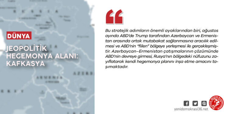 Bu stratejik adımların önemli ayaklarından biri, ağustos ayında ABD’de Trump tarafından Azerbaycan ve Ermenistan arasında ortak mutabakat sağlanmasına aracılık edilmesi ve ABD’nin “fiilen” bölgeye yerleşmesi ile gerçekleşmiştir. Azerbaycan–Ermenistan çatışmalarının çözümünde ABD’nin devreye girmesi, Rusya’nın bölgedeki nüfuzunu zayıflatarak kendi hegemonya planını inşa etme amacını taşımaktadır. Ermenistan’ın Batı’ya ekonomik ve askerî açıdan bağımlı hale getirilmesi, Azerbaycan’ın enerji ihracatının Batı sermayesinin kontrolüne girmesi ve Güney Kafkasya’da NATO’nun tedricen konuşlanması, bu planın somut parçalarıdır. Tekrar “barış” kelimesi altında, emperyalist merkezler yeni bir jeopolitik hegemonya aracı devreye sokmaktadır.