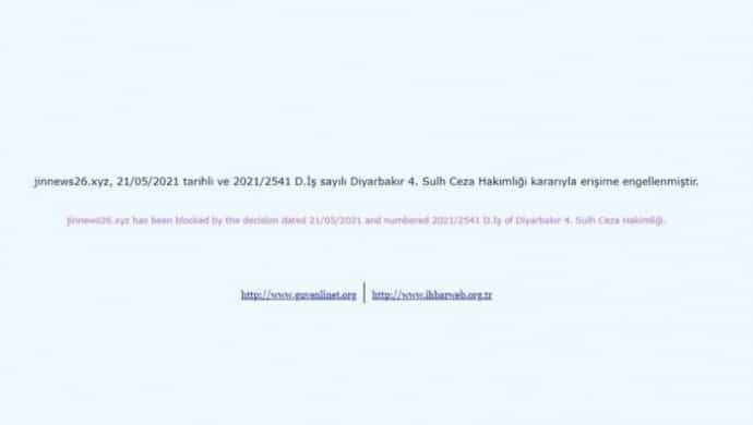 HABER MERKEZİ- Jinnews’in, jinnews26.xyz ve jinnews27.xyz uzantılı internet adresi, Diyarbakır 4’üncü Sulh Ceza Hakimliği kararıyla erişime engellendi.
